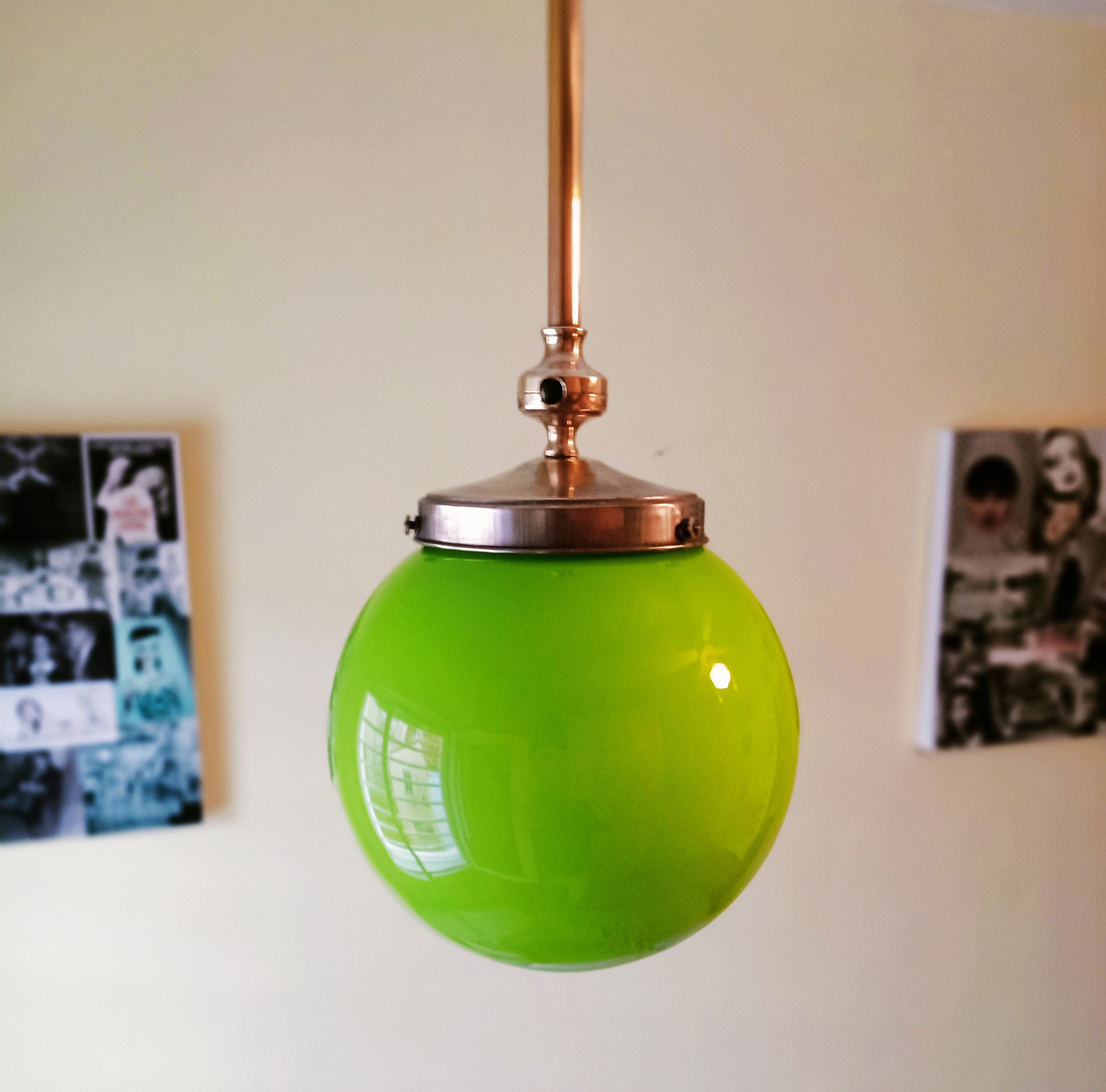 – Espectacular Lámpara muy pop de acero naranja y globo de opalina blanco creando un potente contraste de tonos