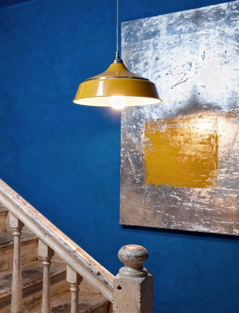 – Se compone de una pantalla bicolor (azul por fuera y blanco por dentro) sujetada por un cable tela negro, un portalámpara y un florón de metal cromado creando un impactante contraste de tonos
