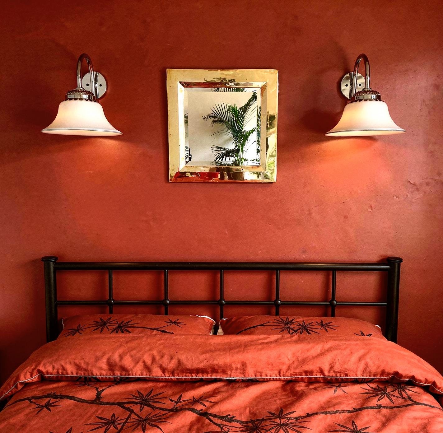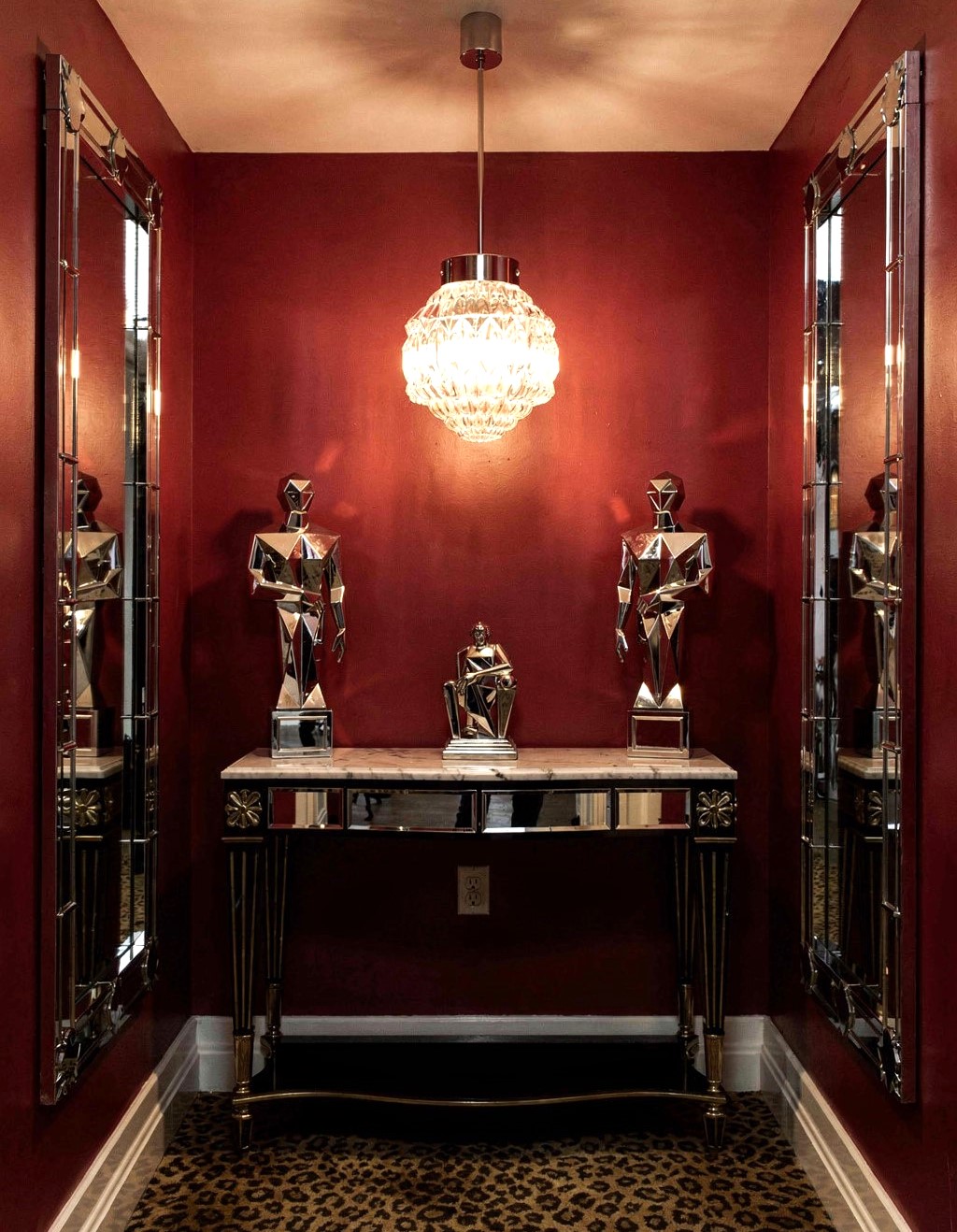 – Pie de metal cromado con embellecedores rojos sujetando una magnifica tulipa «semi globo» de cristal rojo creando un impactante contraste de tonos