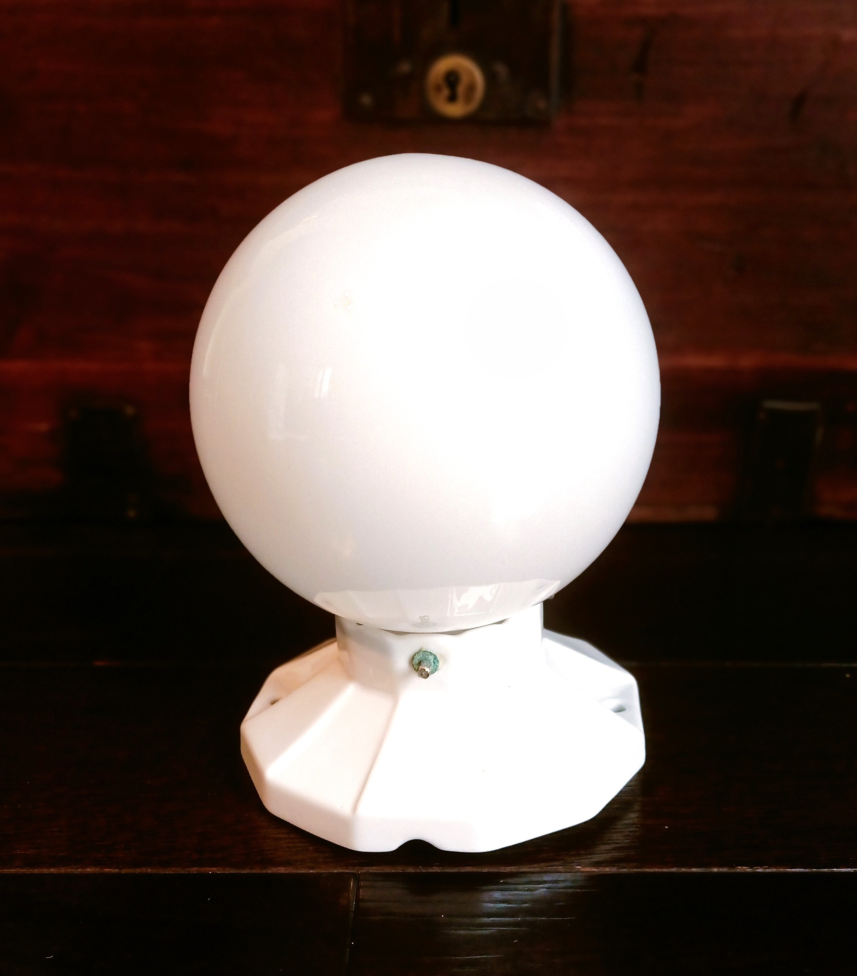 – Base de porcelana sujetando el globo de opalina blanca para un look rústico auténtico