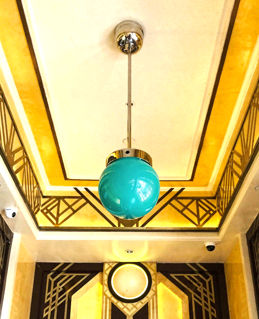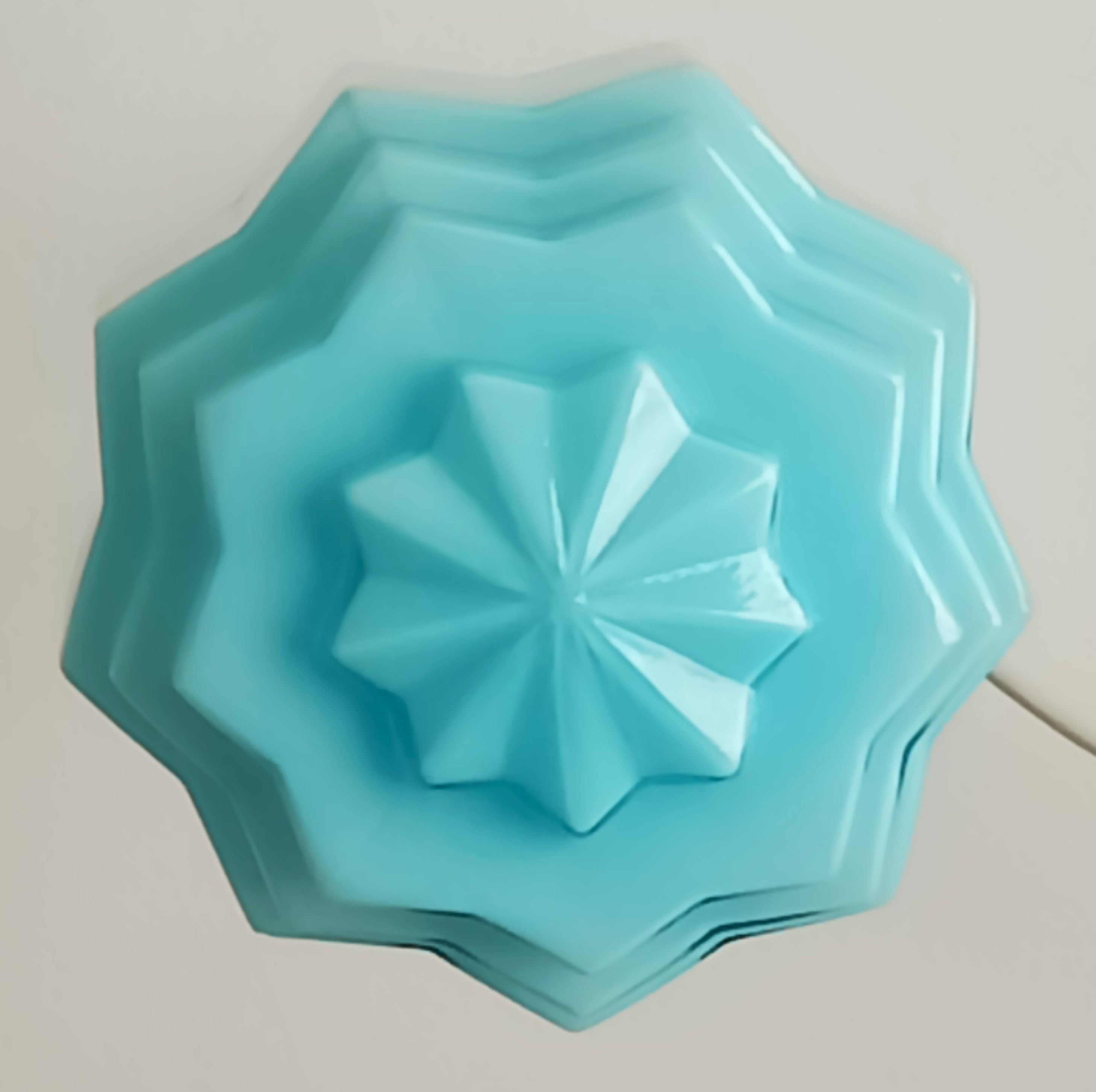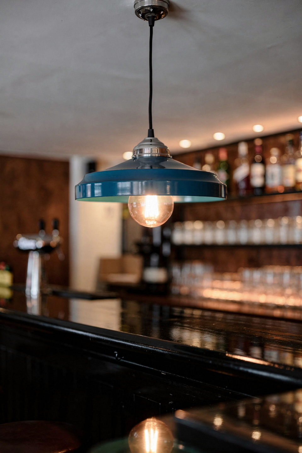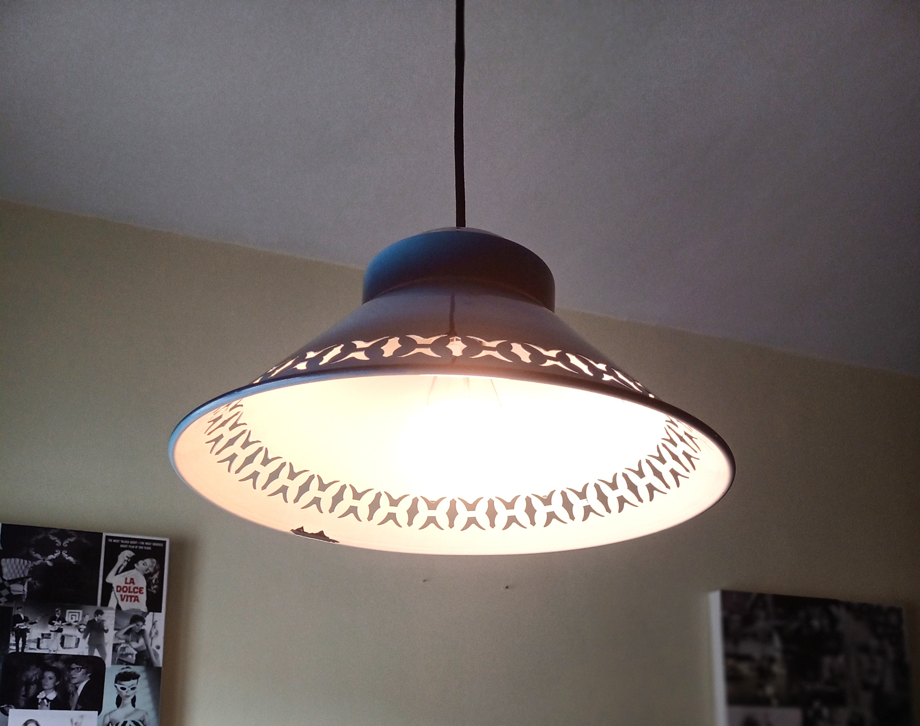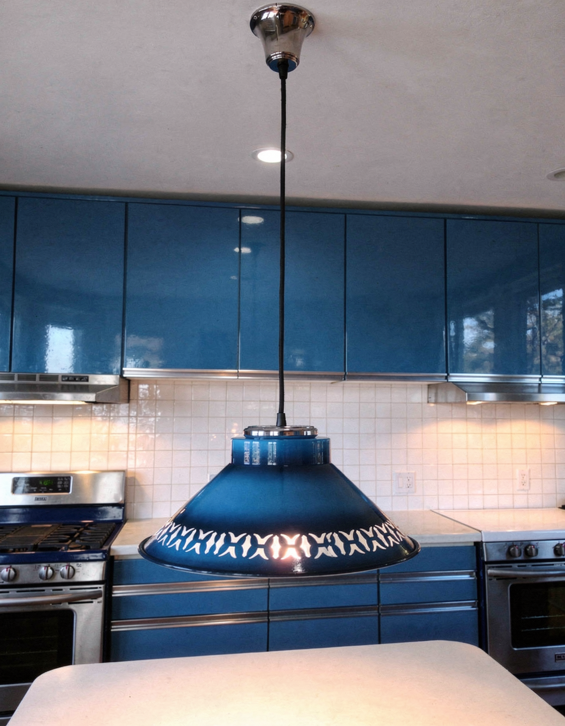 – Elegante lámpara de techo de color azul con un sutil degradé y «perforaciones decorativas»