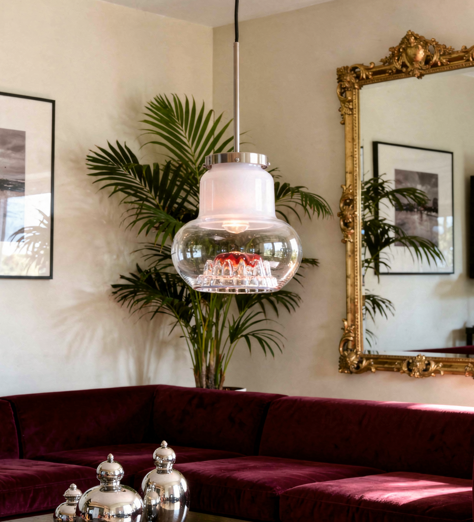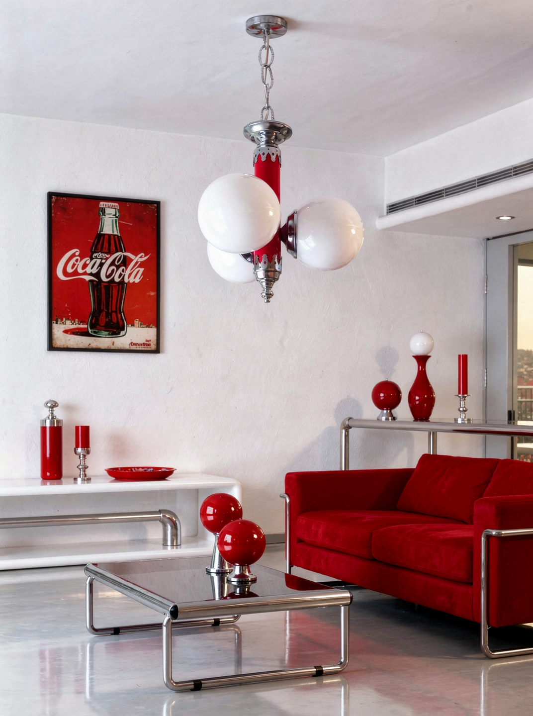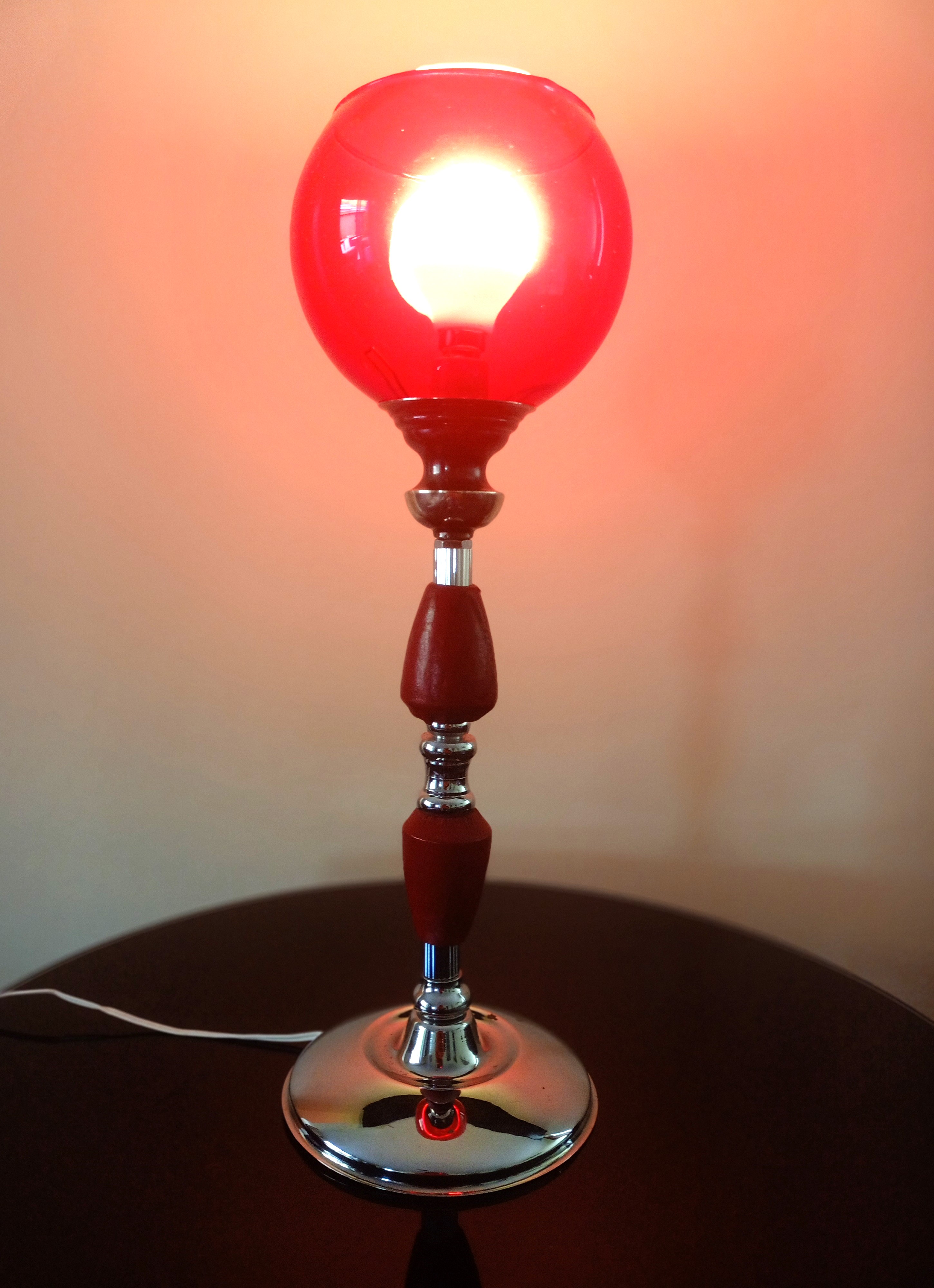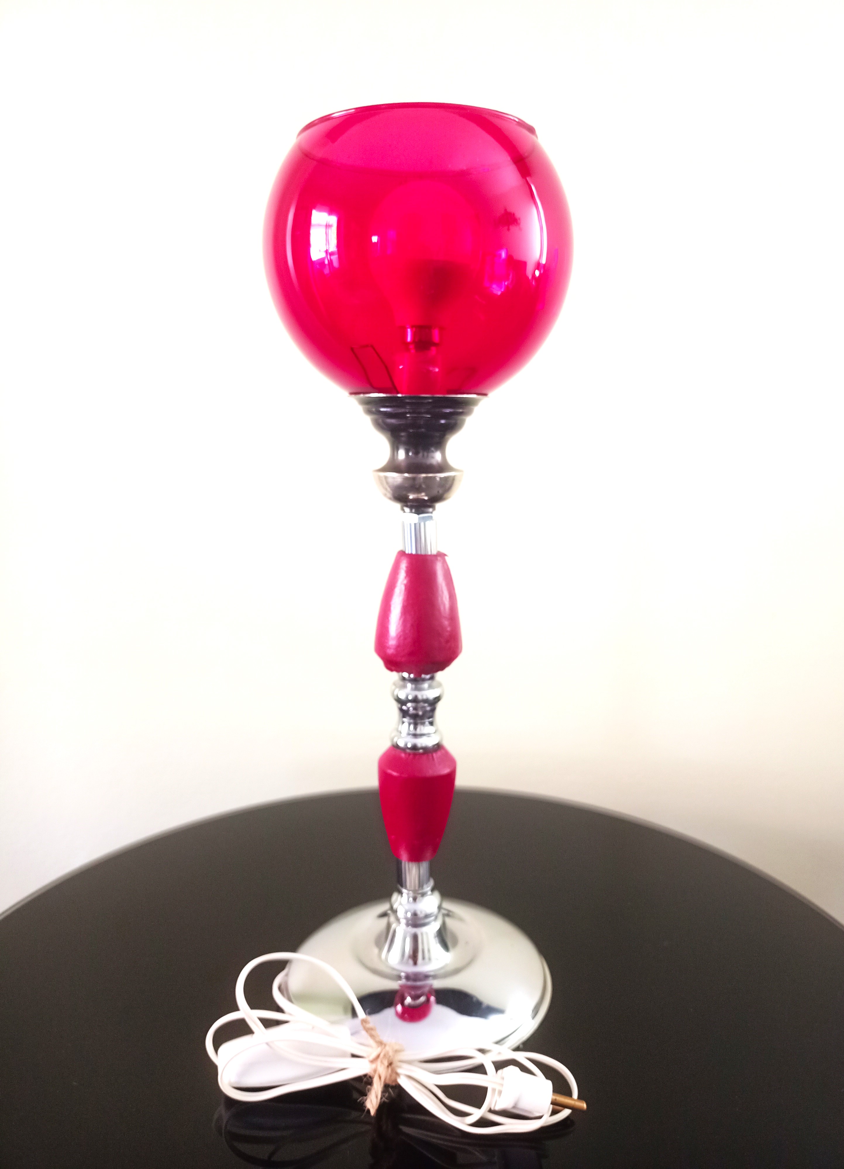 – Pie de metal cromado con embellecedores rojos sujetando una magnifica tulipa «semi globo» de cristal rojo creando un impactante contraste de tonos