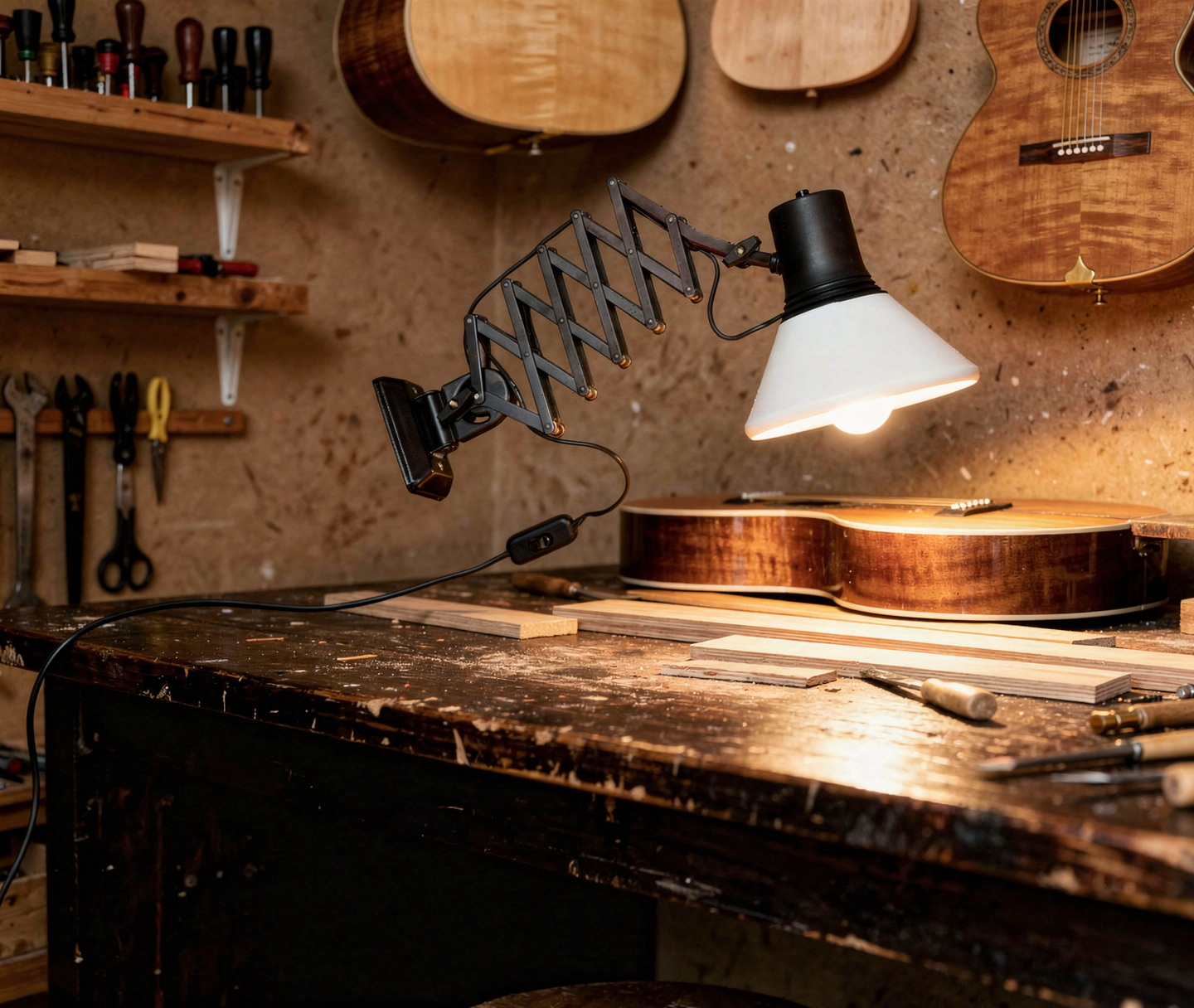 – Se compone de 2 brazos de hierro articulados, una cabeza orientable (180 grados) y una base de hierro para fijar la lámpara a la mesa de trabajo o a la pared (con 4 tornillos)