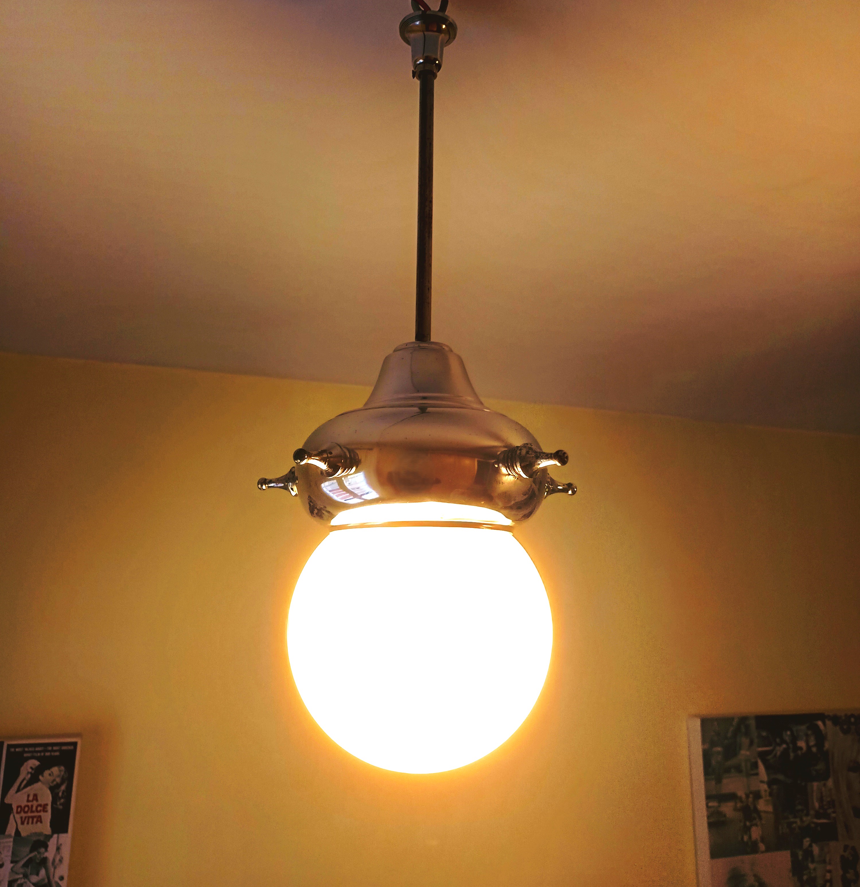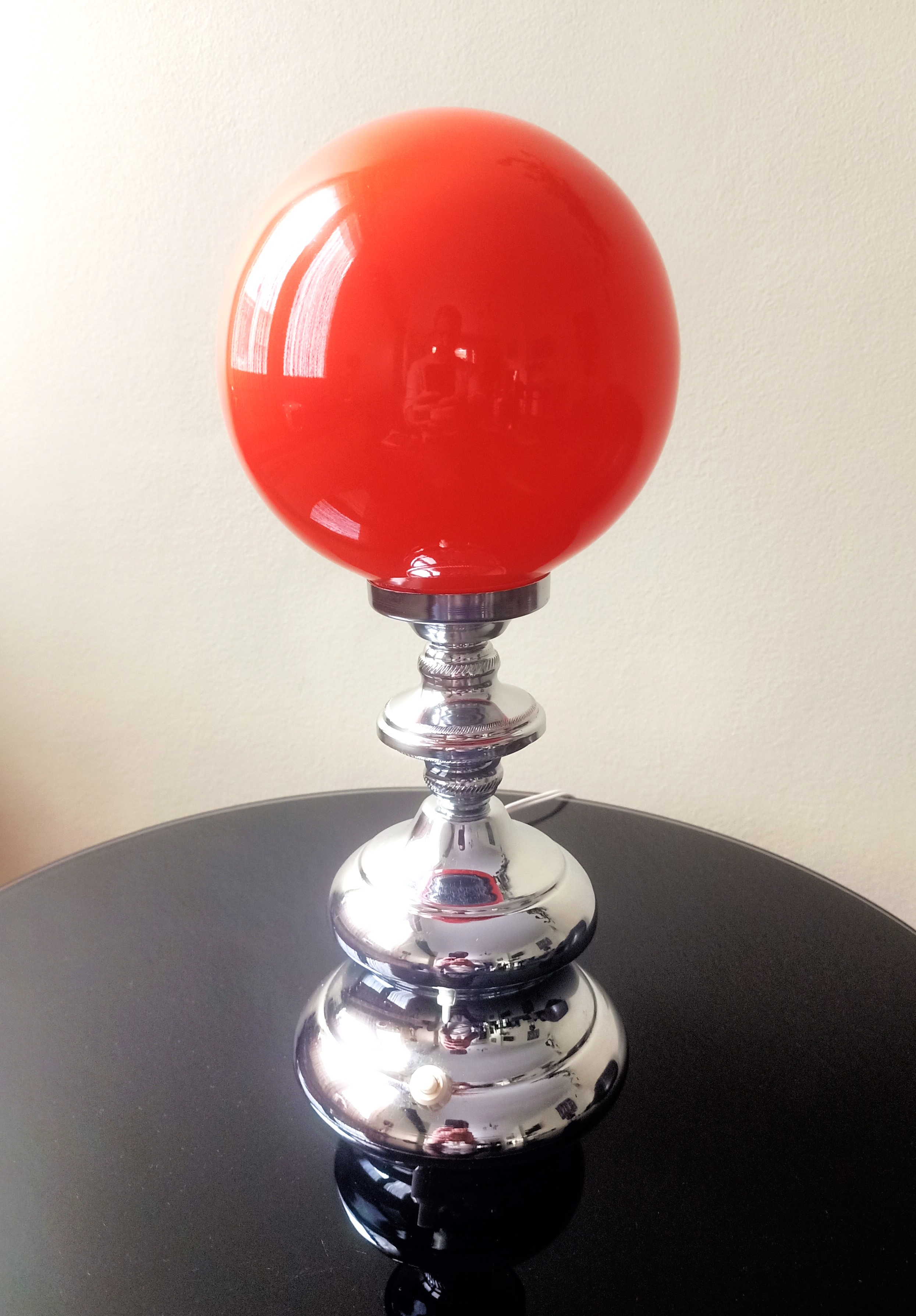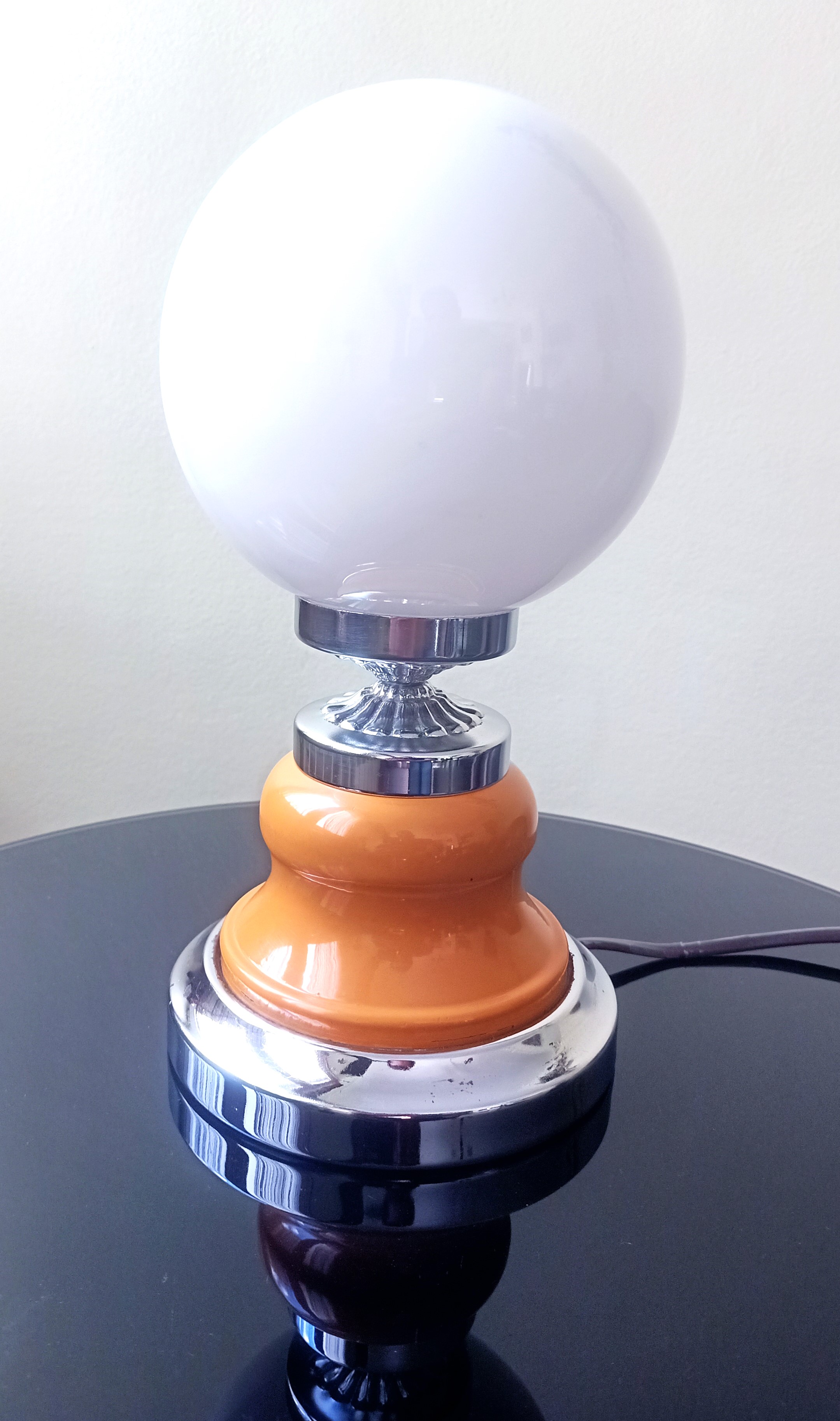 – Espectacular Lámpara muy pop de acero naranja y globo de opalina blanco creando un potente contraste de tonos