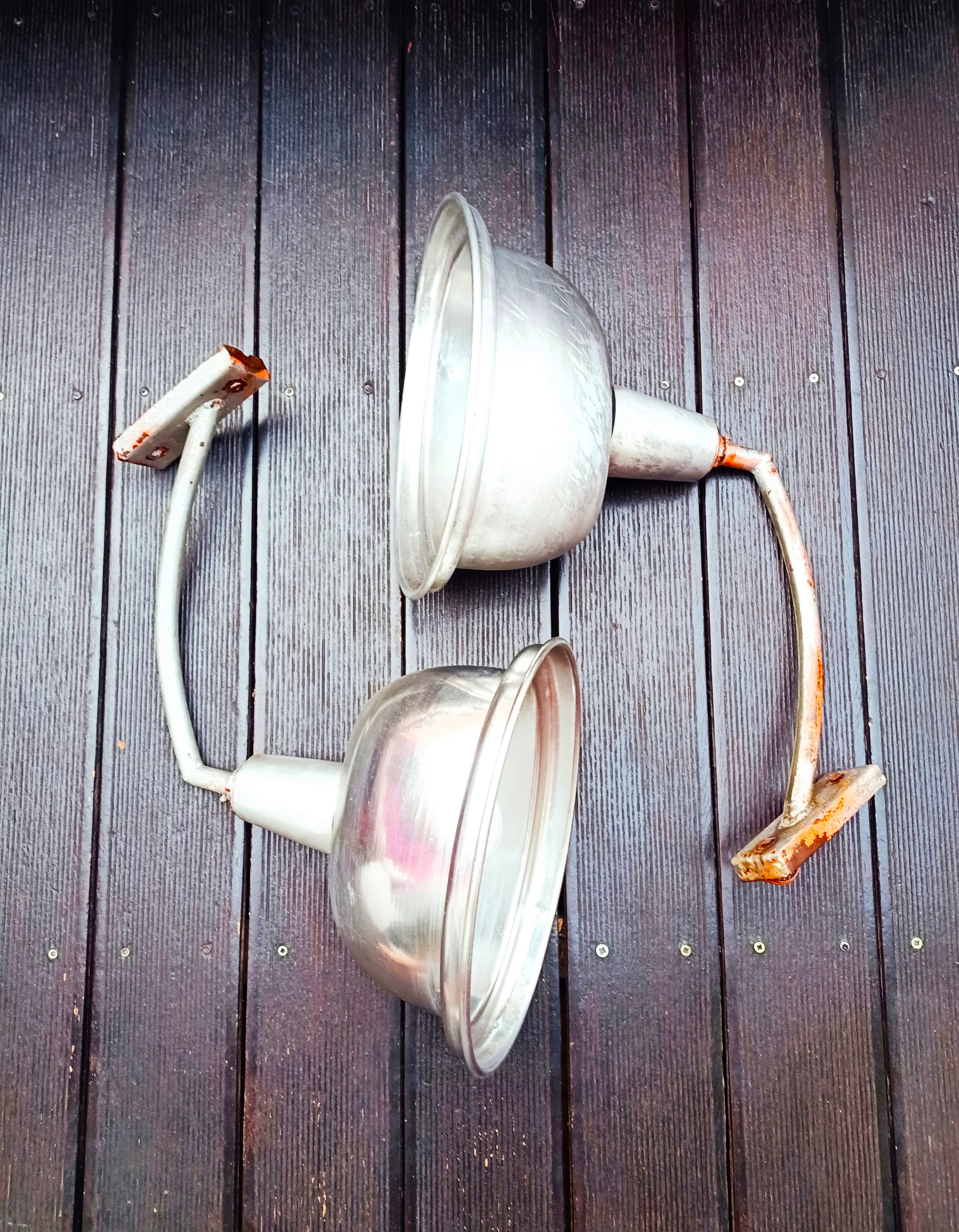 – Brazos de hierro fundido que se fijan en la pared y sujetan 2 pantallas ovaladas de aluminio