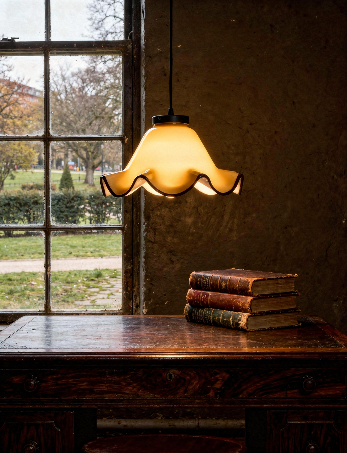 – Dimensión: Altura total de 60cm, diámetro opalina de 23cm y altura de 30cm (en la segunda foto la lámpara no es «proporcional» al salón – foto creada con IA)