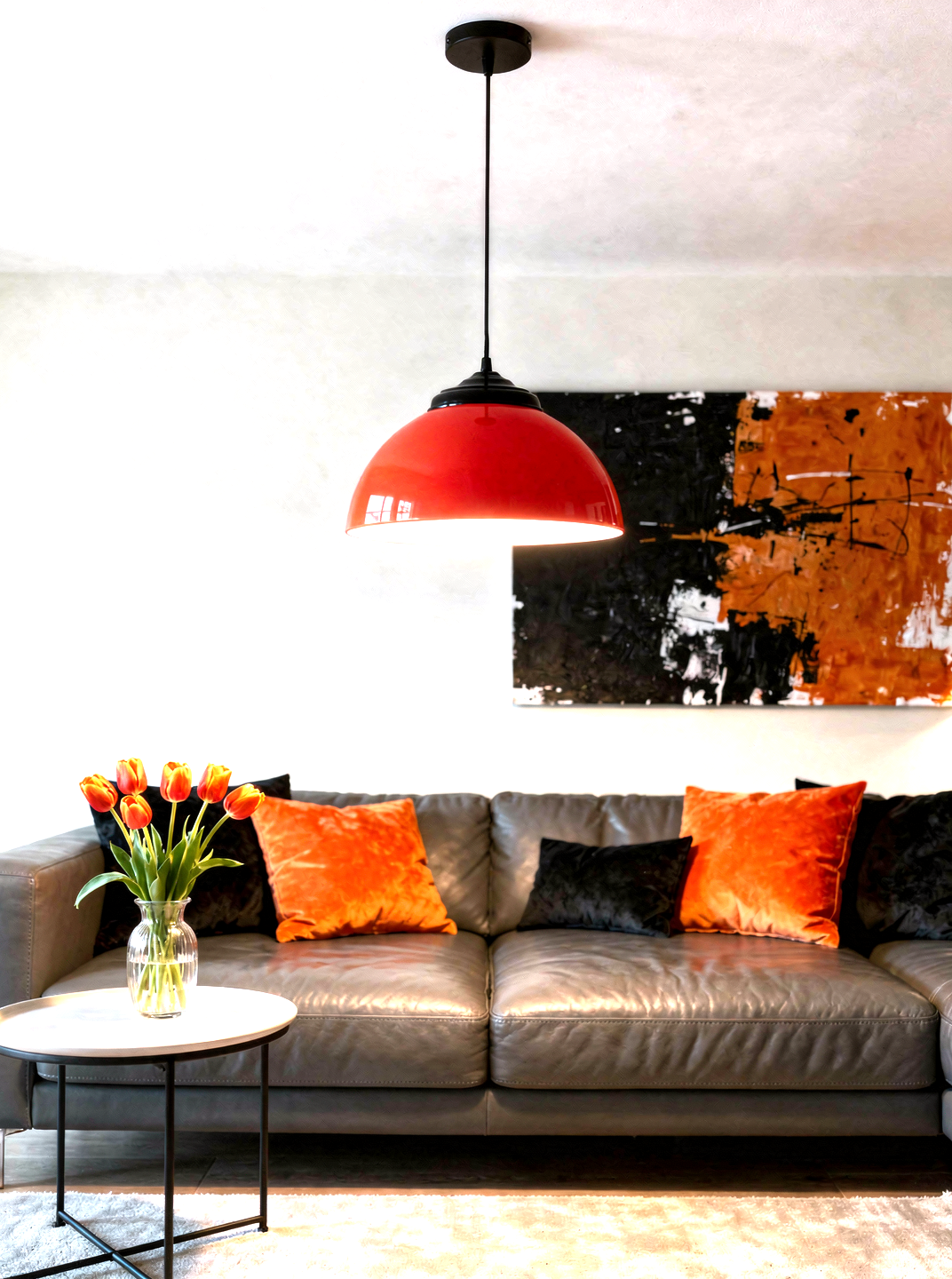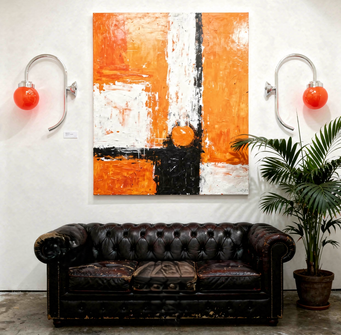 – Magnífica Lámpara de Opalina naranja XL y acero negro creando un potente contraste de tonos