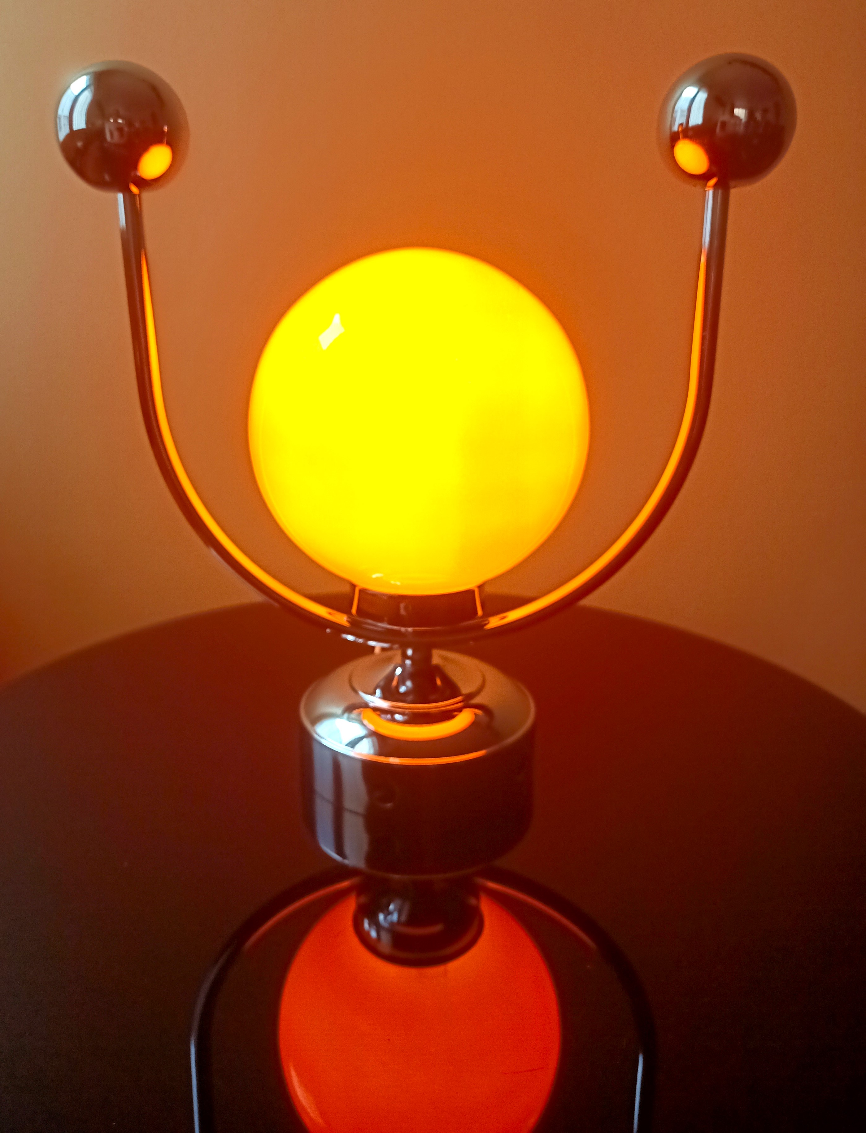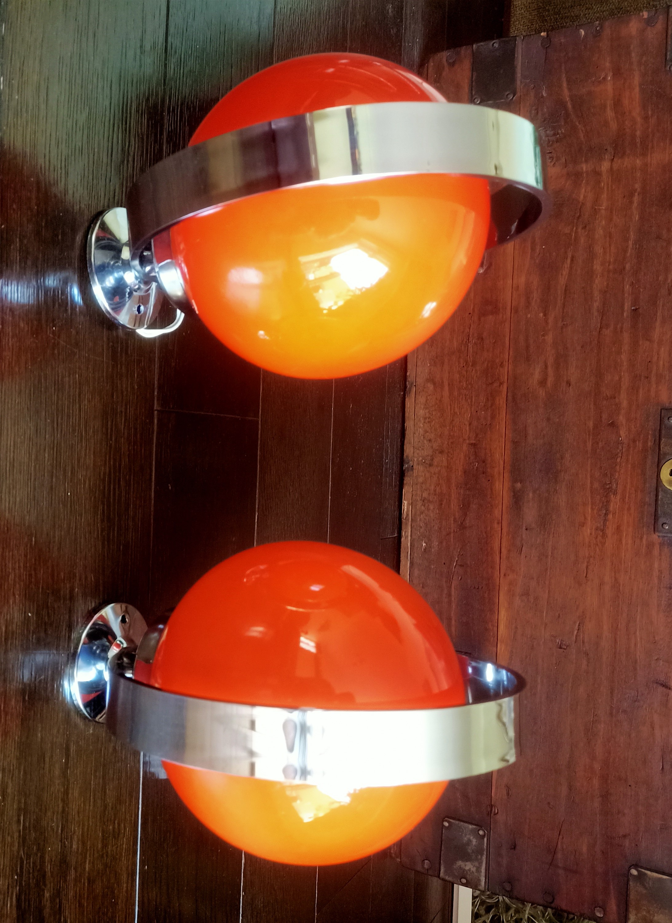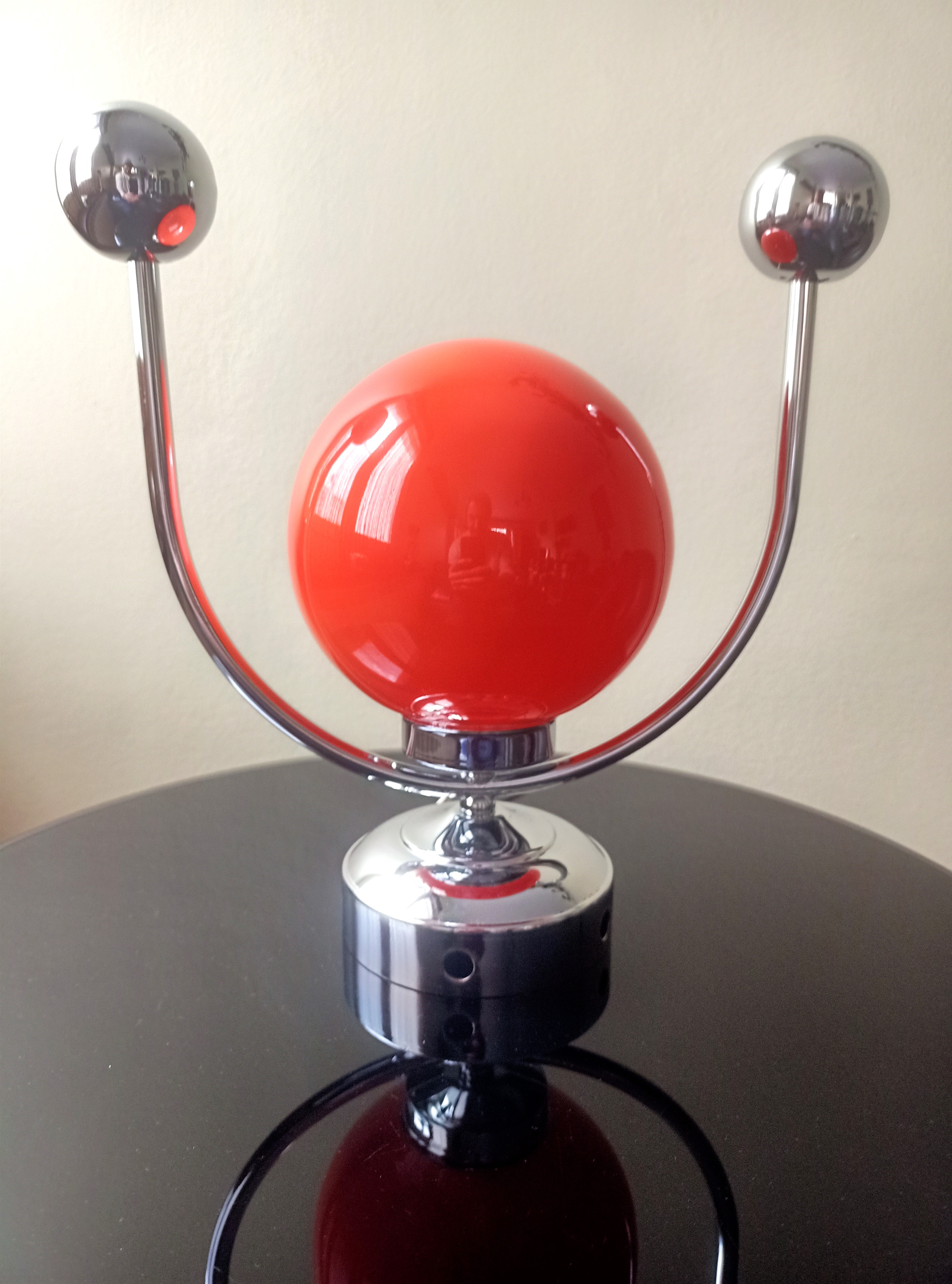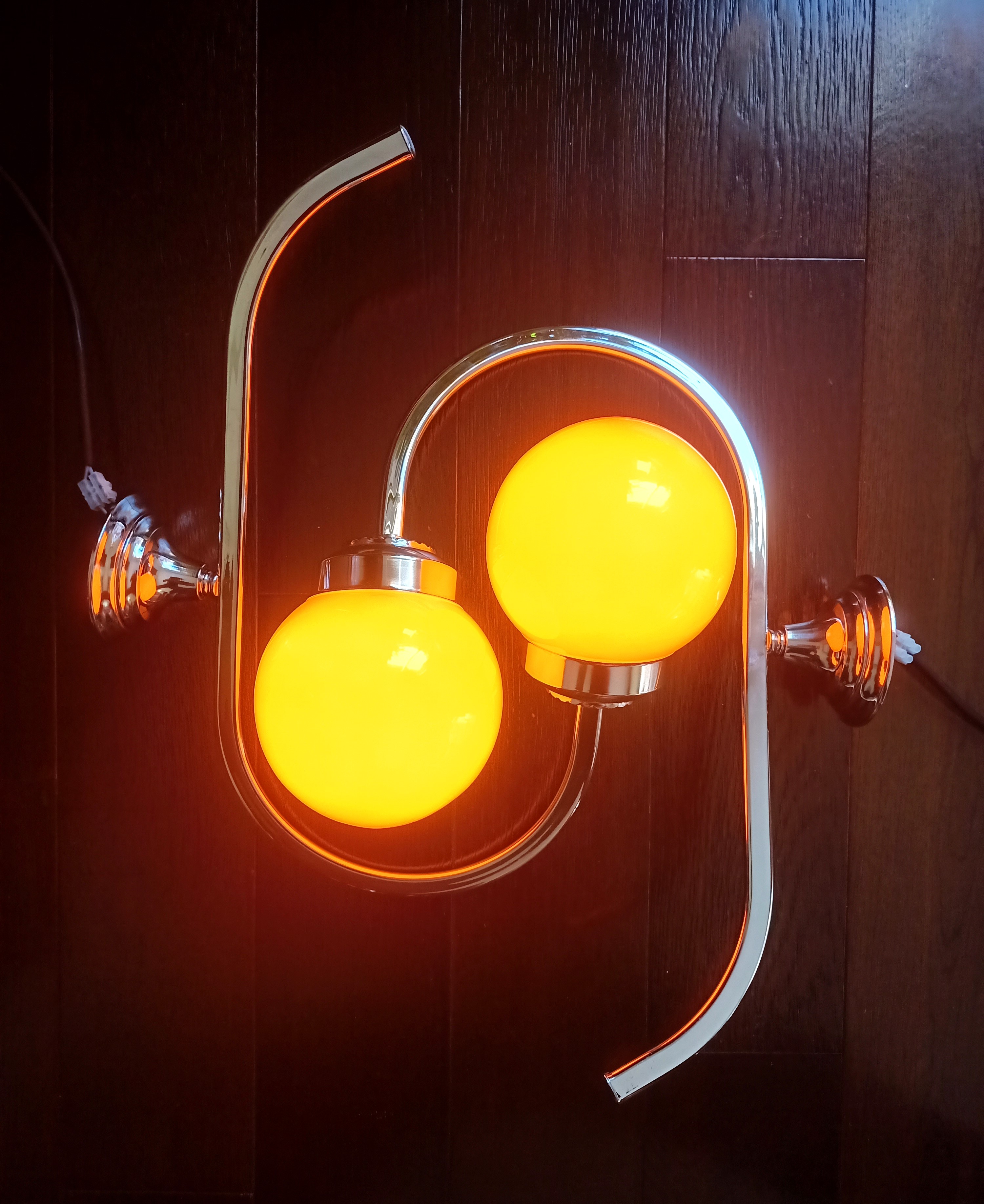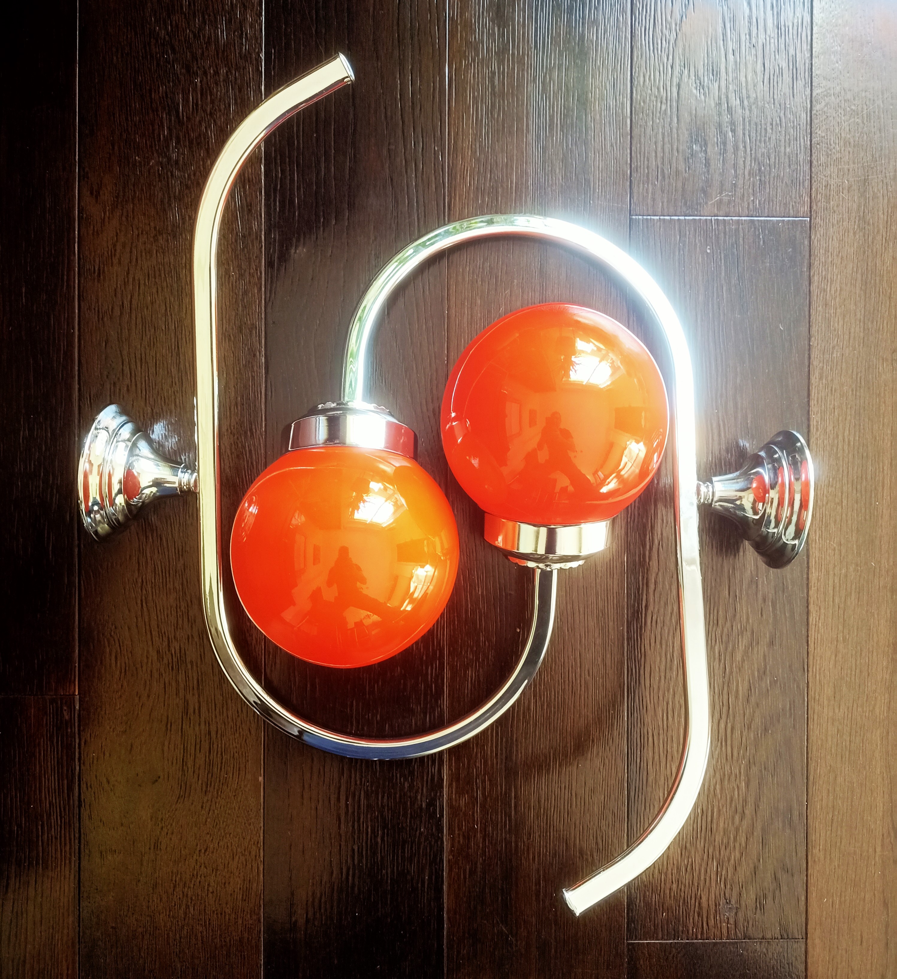 – Exitosa alianza del metal cromado y el cristal naranja creando un potente contraste de tonos y un look futurista – Compuestas de unos brazos de metal cromado sujetando 2 globos de cristal naranja