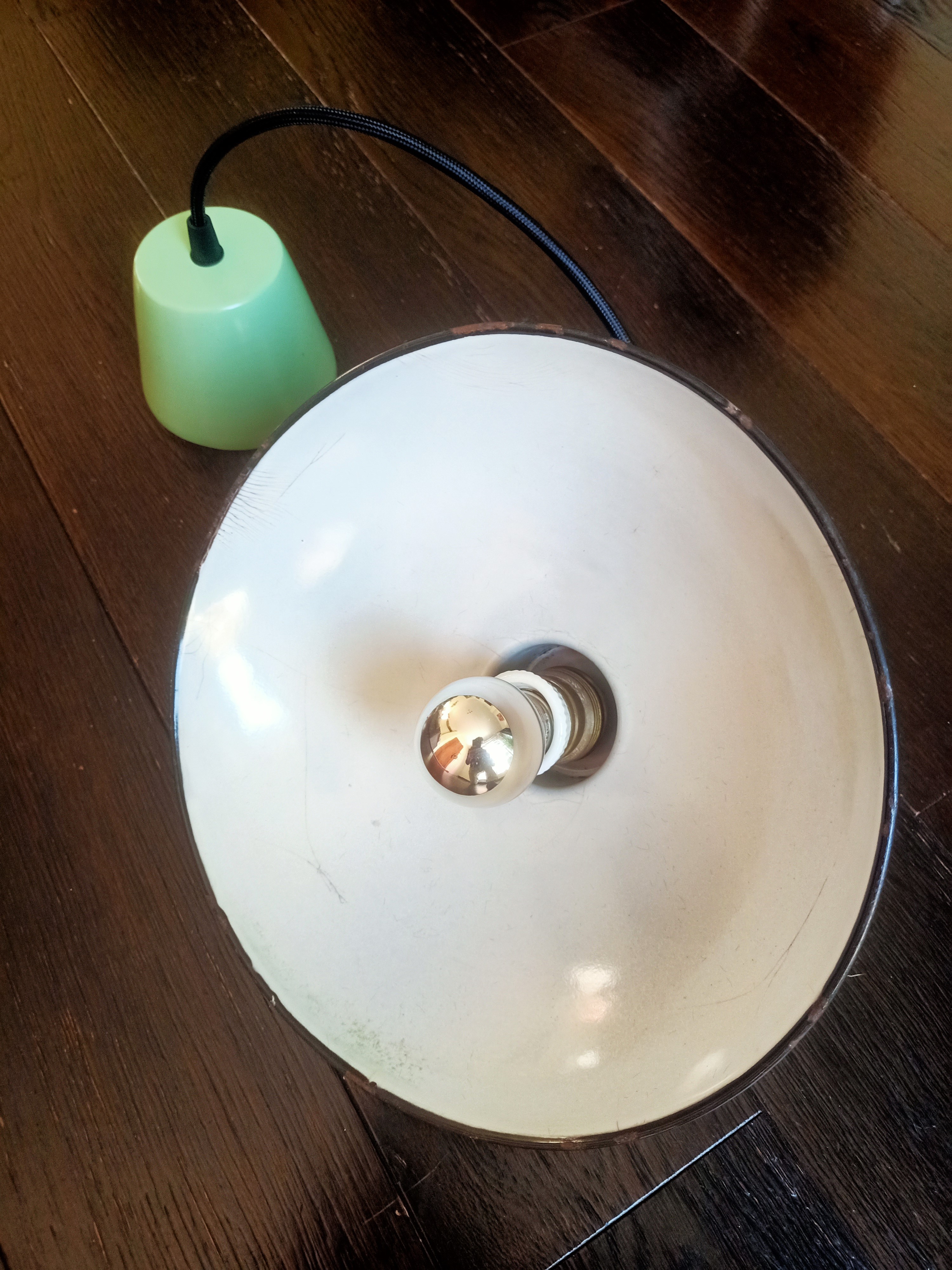 – Icónica Lámpara Industrial de metal esmaltado bicolor (negro por fuera y blanco por dentro) de Francia 50 ́s