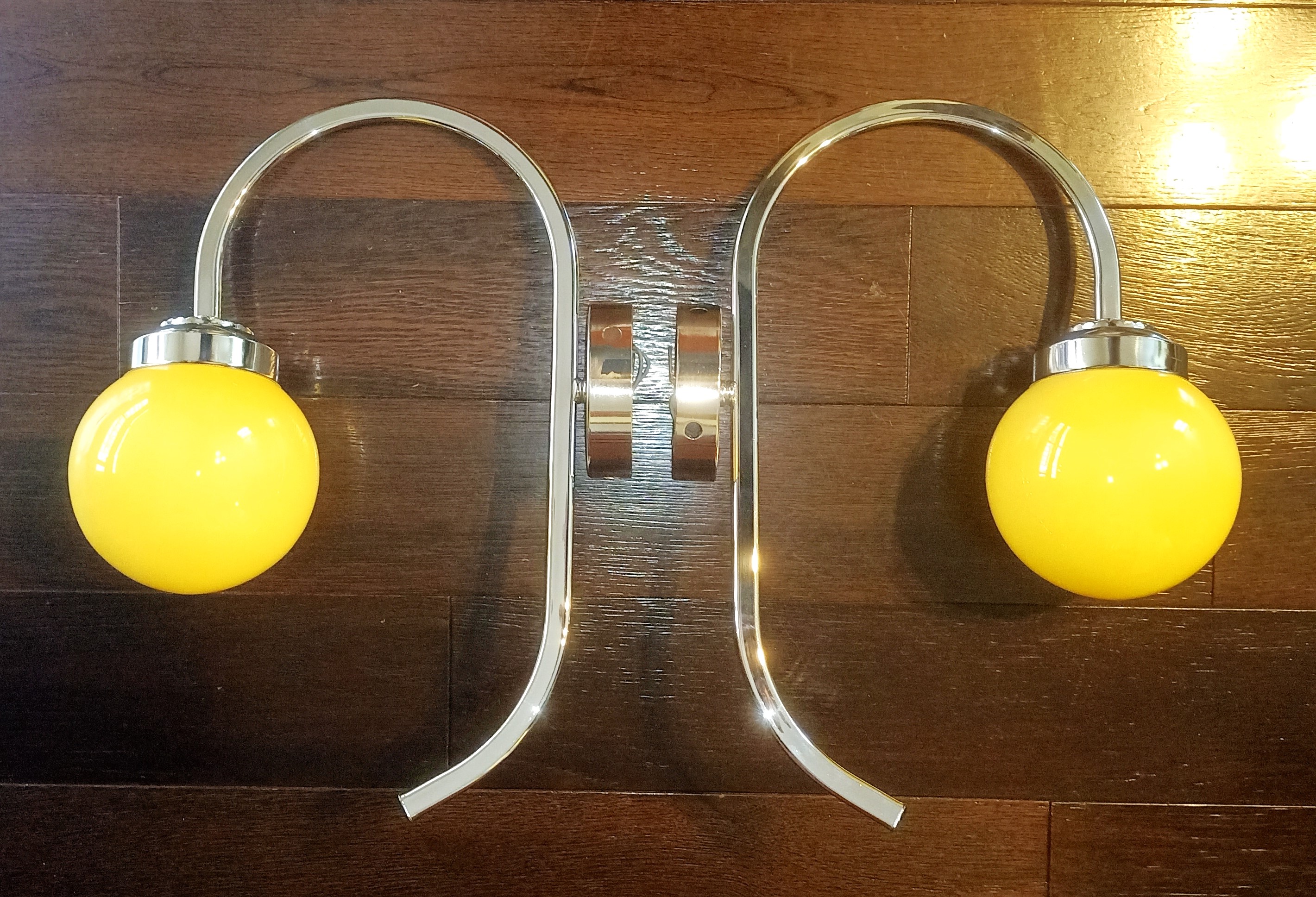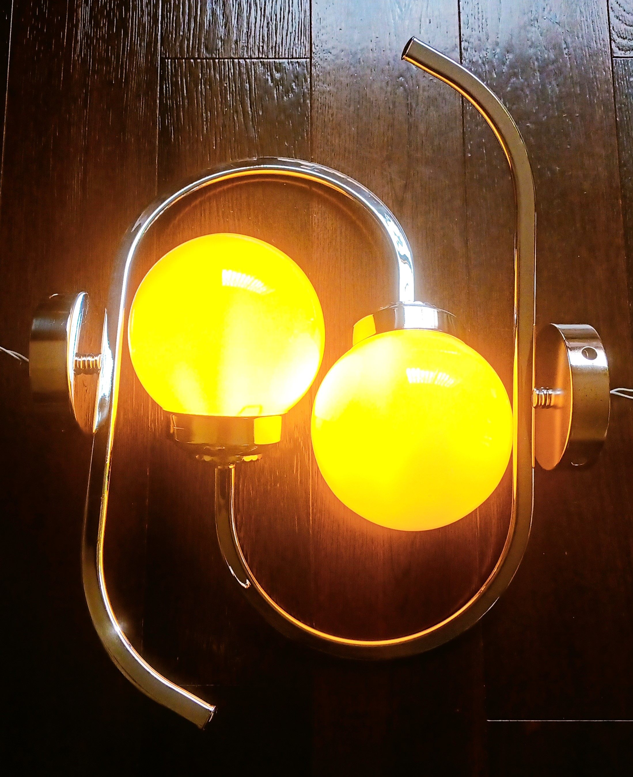 – Exitosa alianza del metal cromado y el cristal amarillo creando un potente contraste de tonos y un look futurista – Compuestas de unos brazos de metal cromado sujetando 2 globos de cristal amarillo