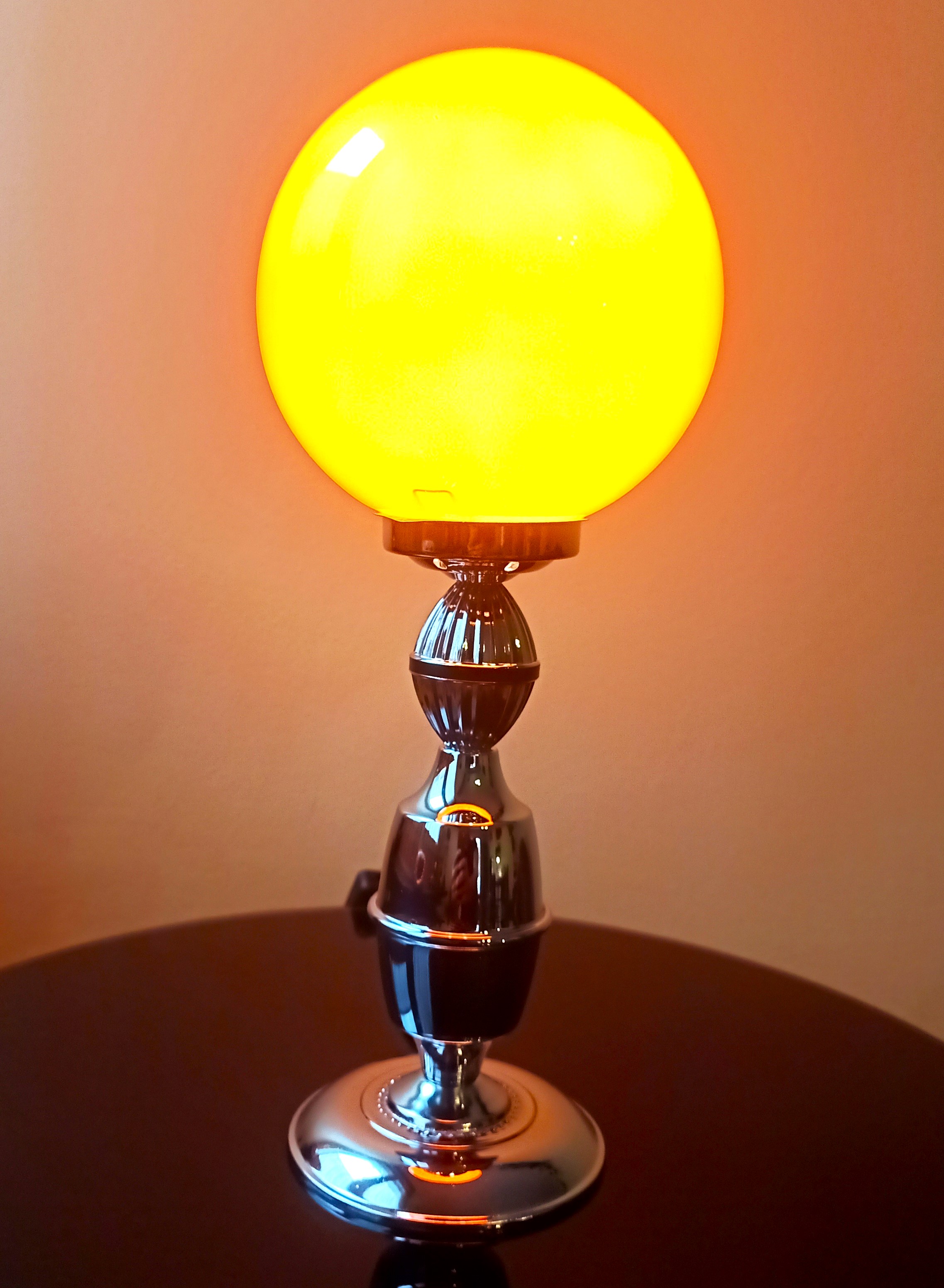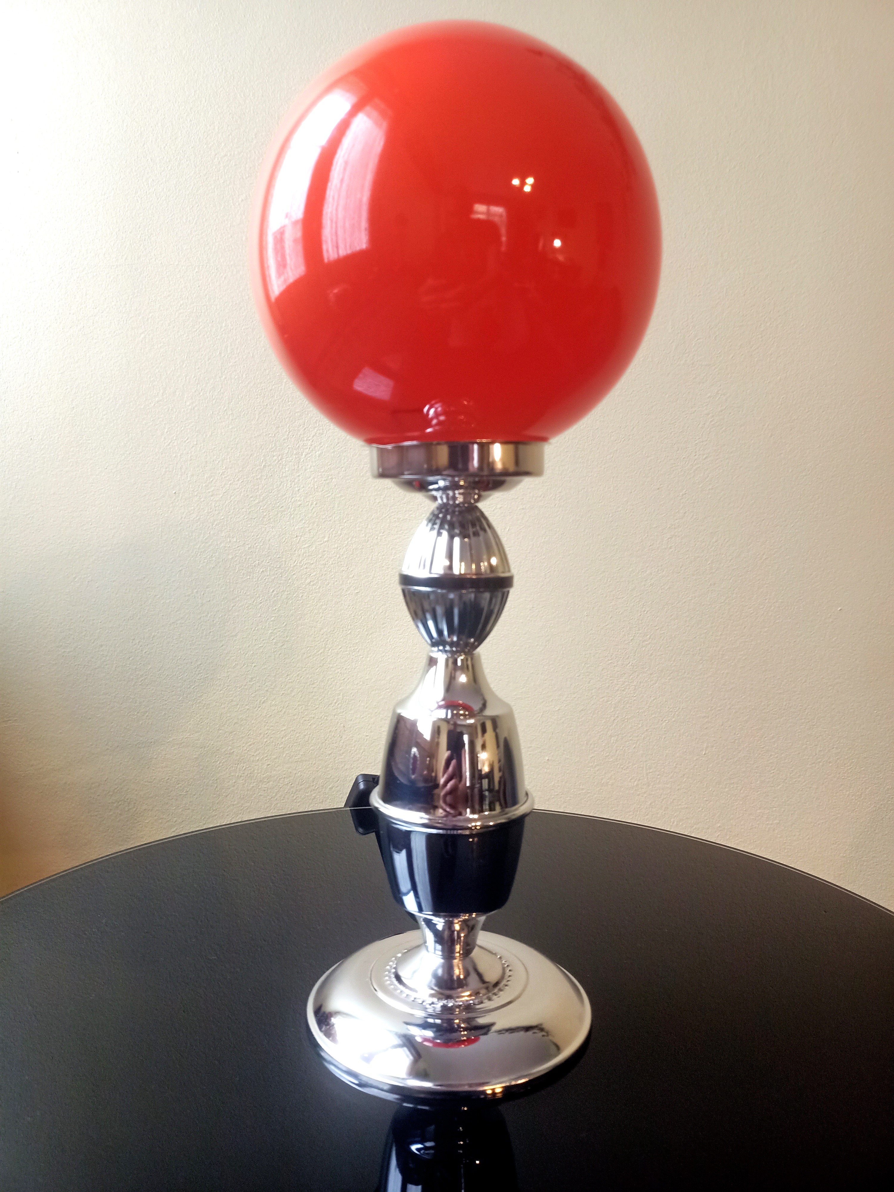 – Base de metal cromado sujetando un magnifico globo de cristal color naranja (aunque parezca rojo en la foto es naranja)