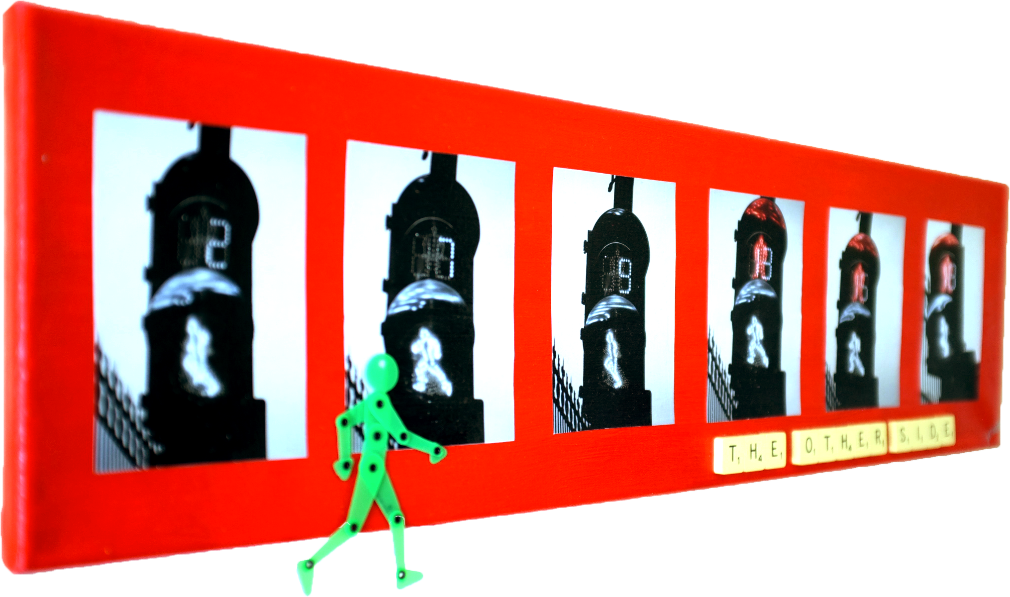 Material: imágenes (fotos de un semáforo que saqué en Puebla Mexico en Julio 2010), Letras del juego Scrabble, Muñequito de plástico G-Star y pintura acrílica sobre lienzo