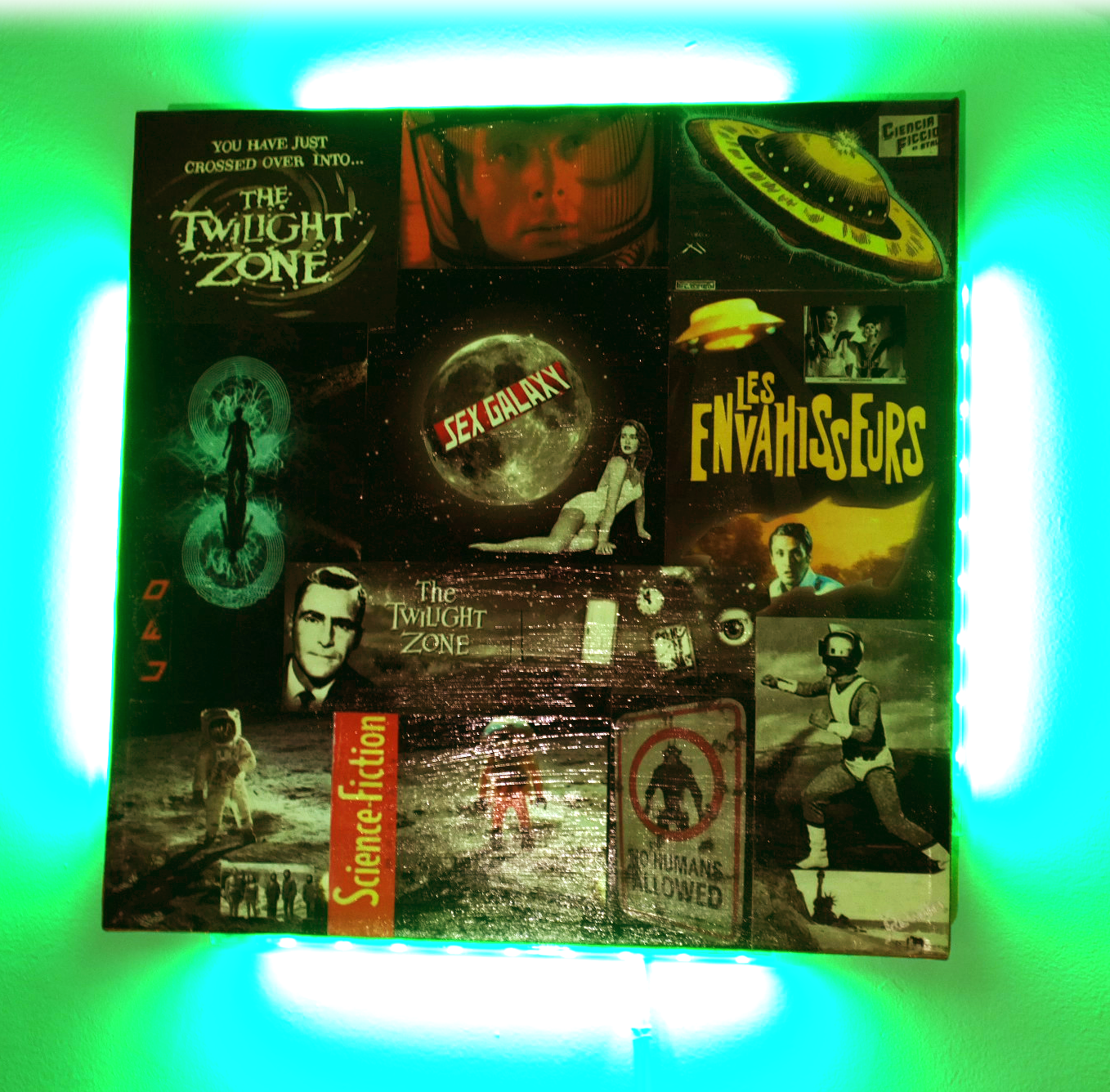 Material: imágenes, pintura acrílica sobre lienzo, tiras de led multicolor