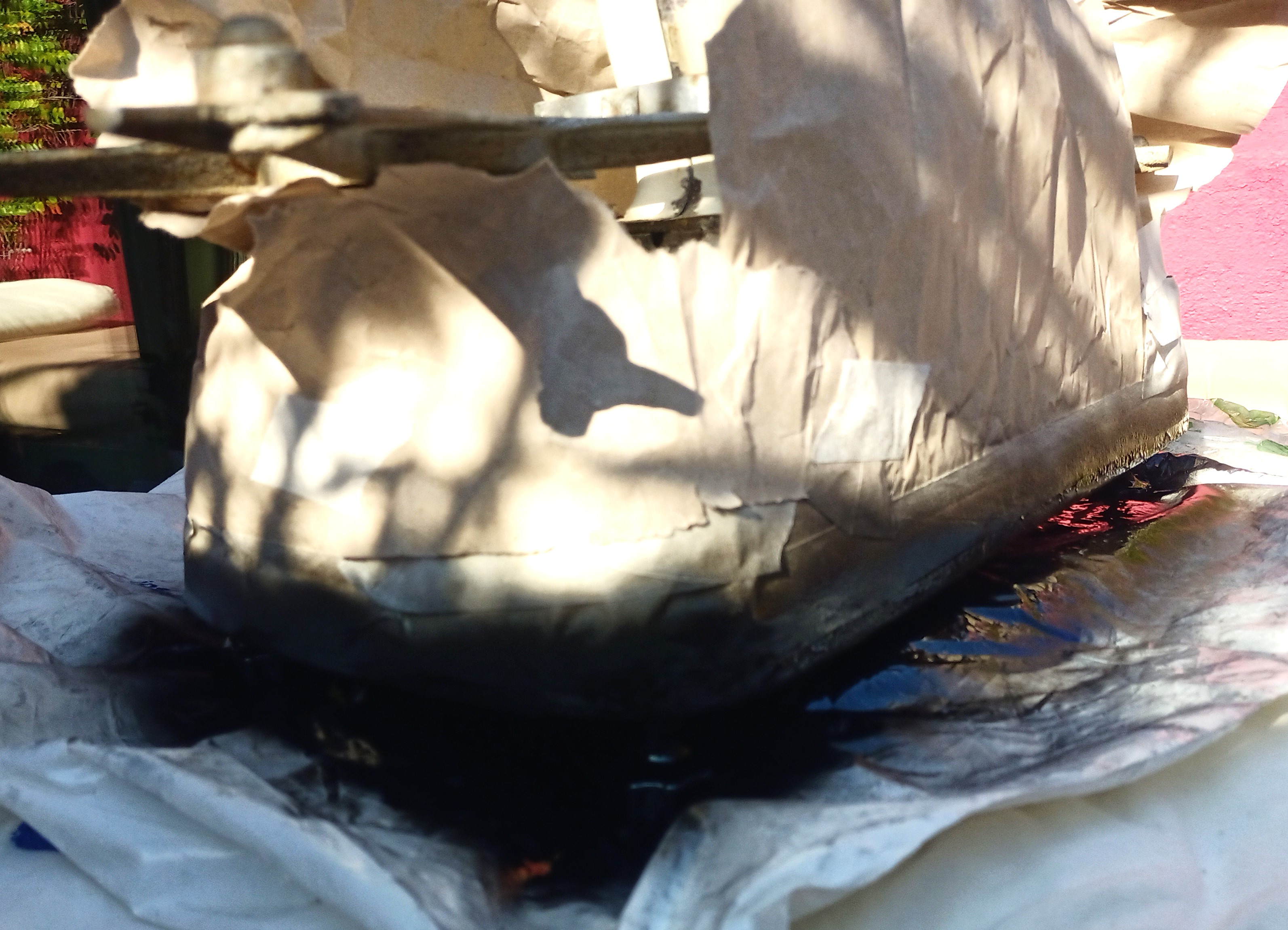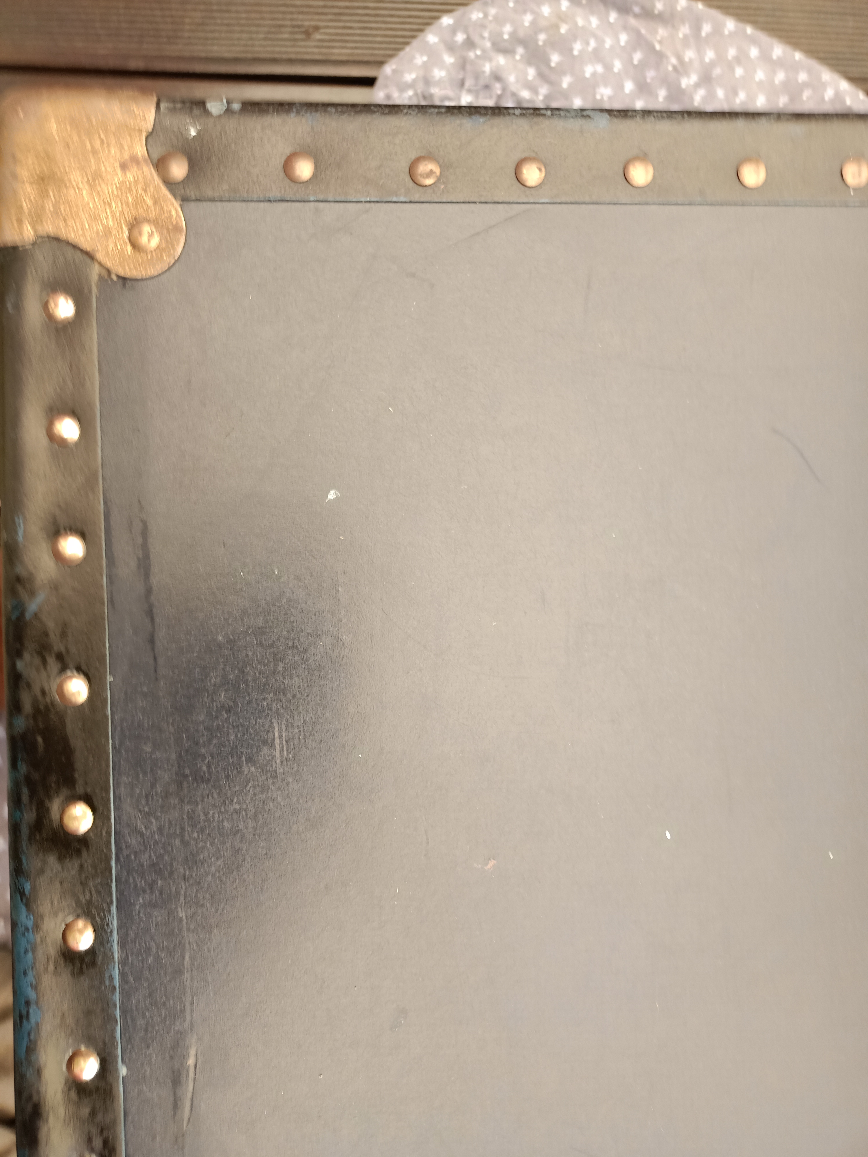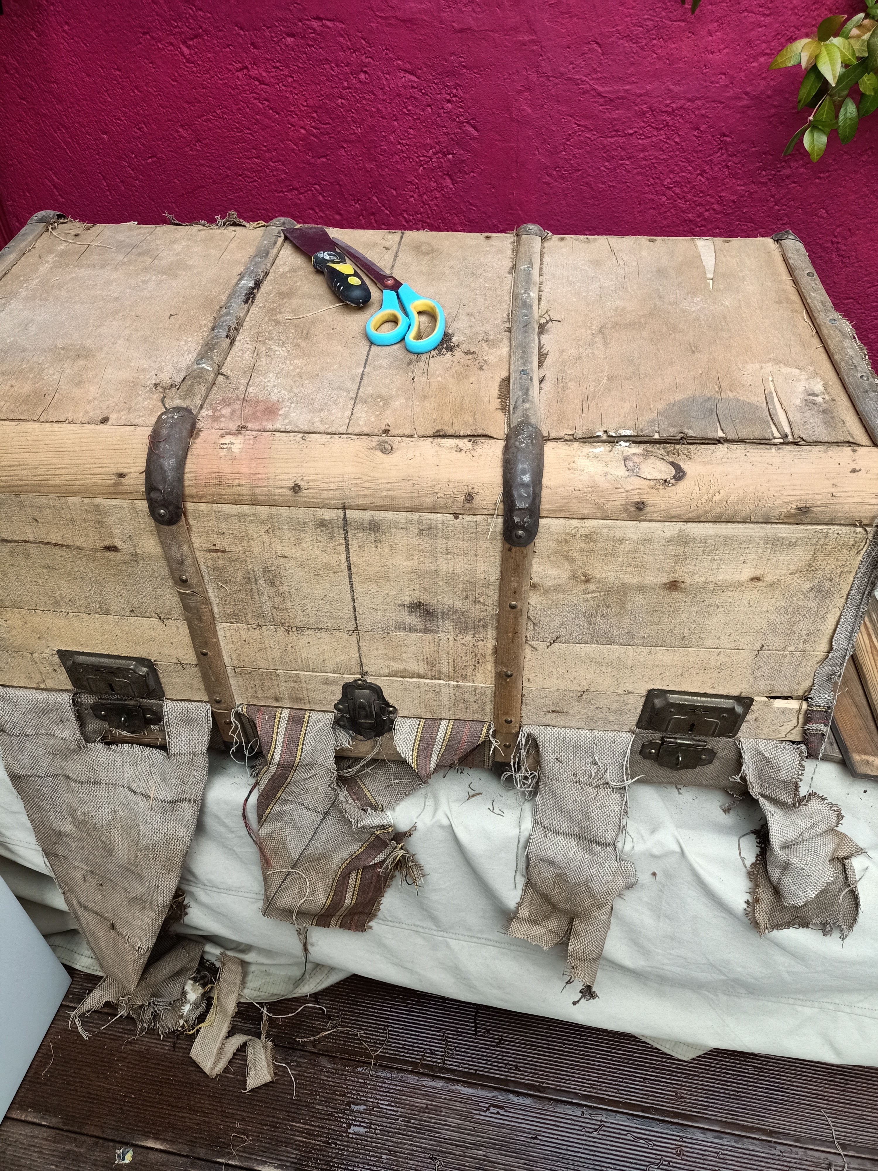 3 Una vez el papel quitado (4 horas!!) dejar secar y lijar todo el exterior y el interior del baul protegiendo los herrajes y las tiras de madera pintados de negro