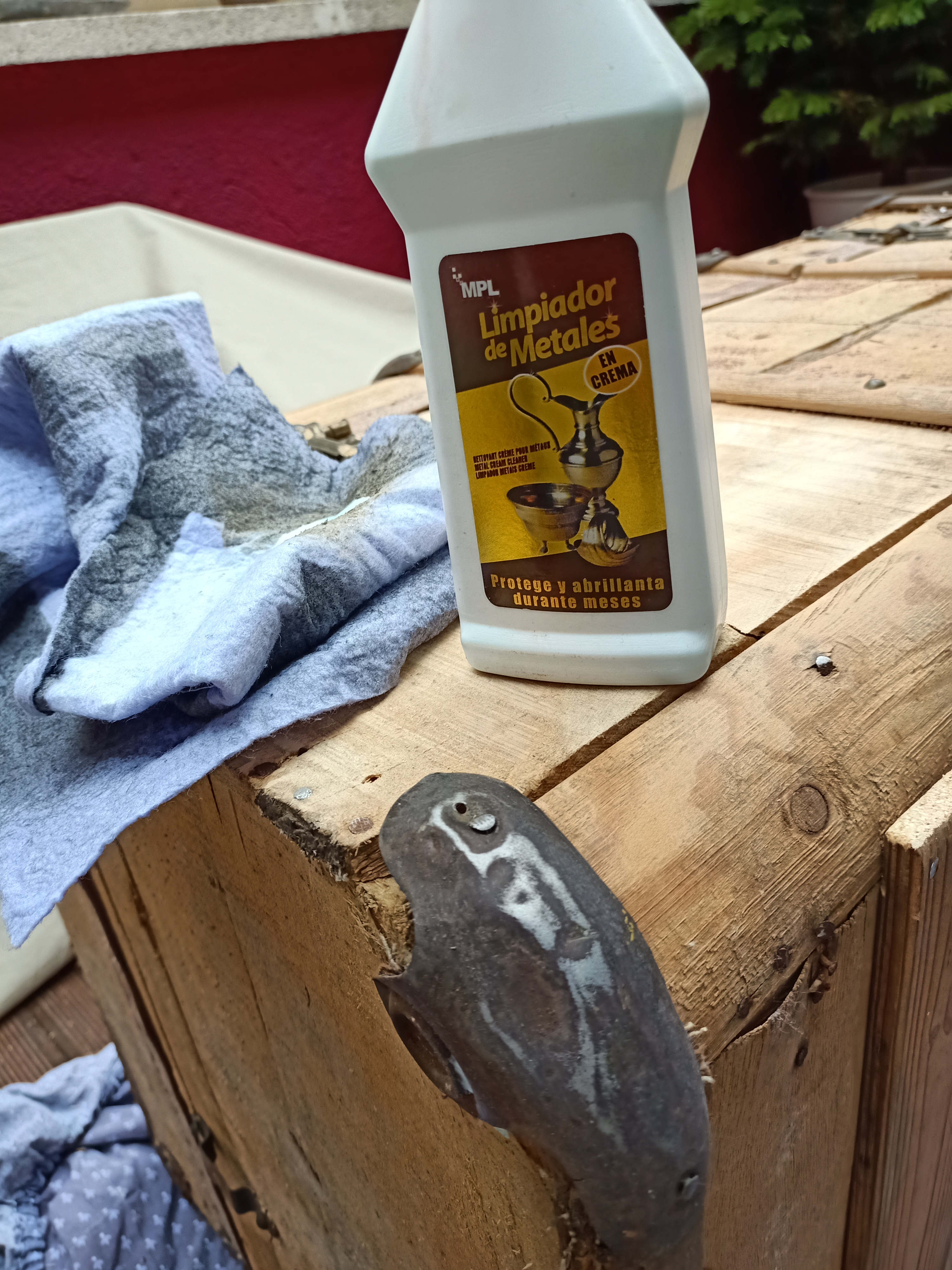 2 luego empezamos con el muy laborioso proceso de limpiar el alpaca: producto para metal (Sidol) y trapo para la base y maquinita de lustrar (con varias cabezas más o menos duras y finas) para todos los otros elementos