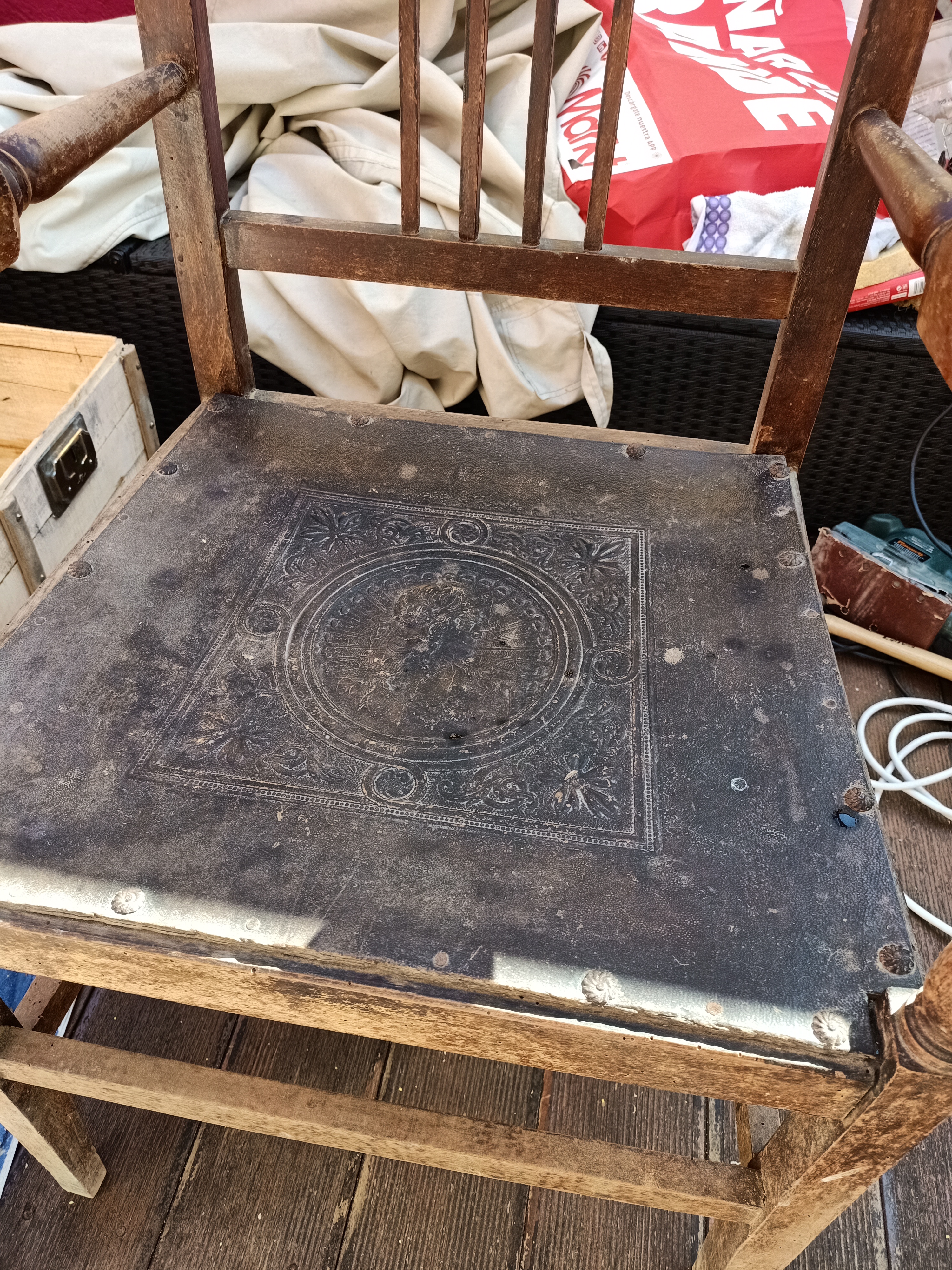 Compré este Sillón Modernista en la Sierra de Madrid en Marzo 2021, con barniz desgastado y mucha carcoma.