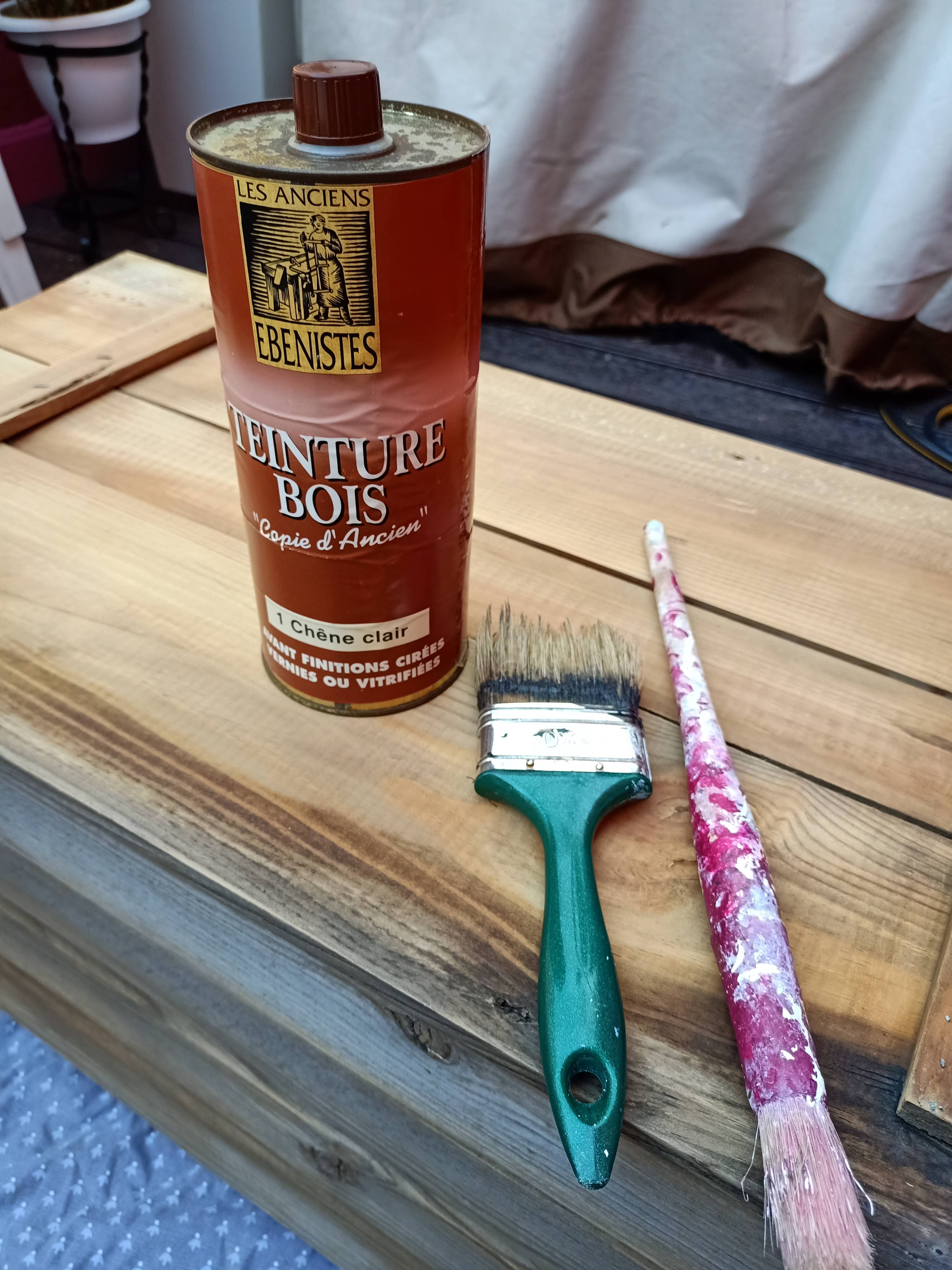 4 Con una brocha le damos una capa de Lasure o Barniz satinado de un tono clarito: el objetivo es proteger la madera y darle un aspecto «menos bruto» y «más elegante»