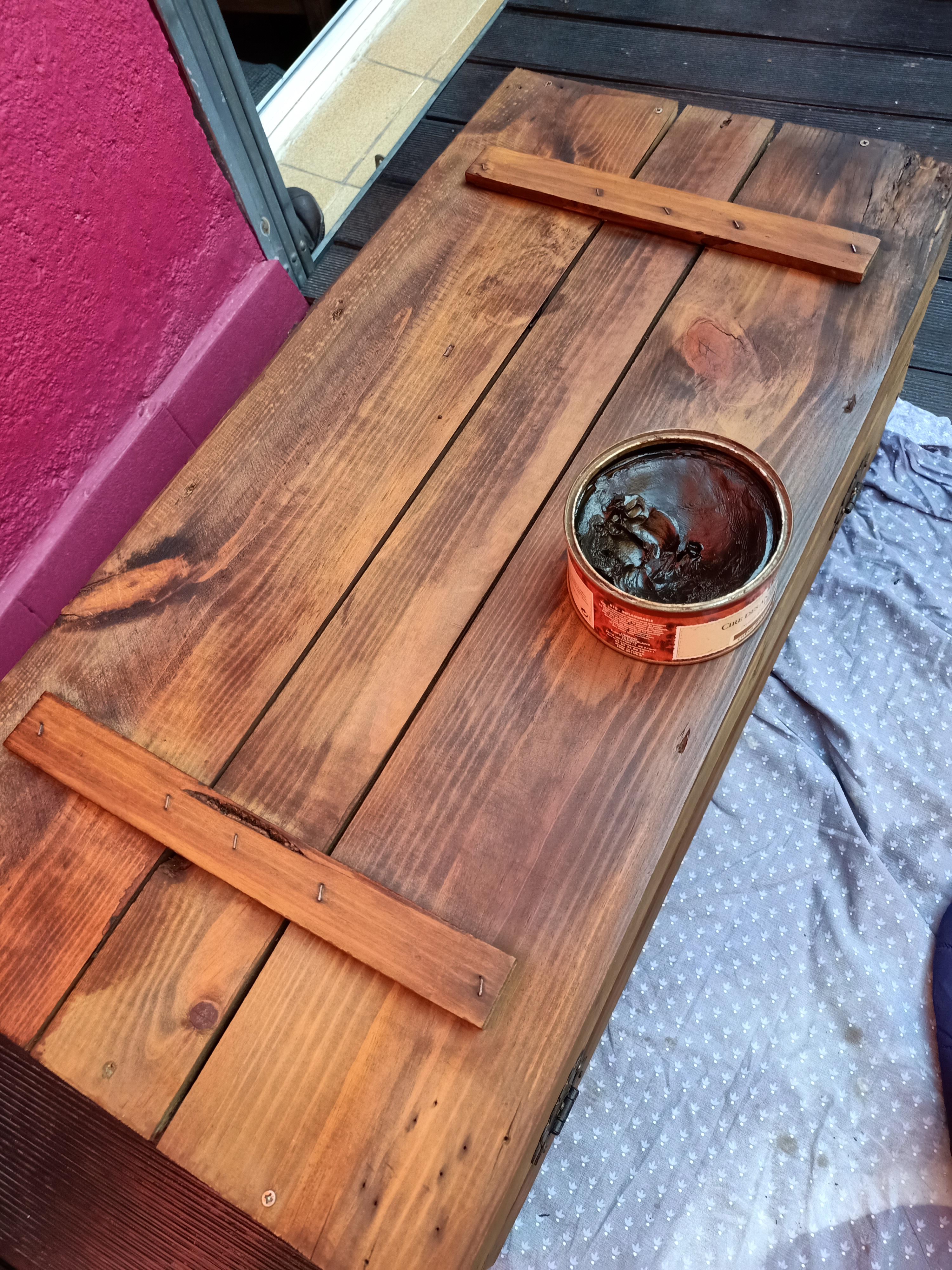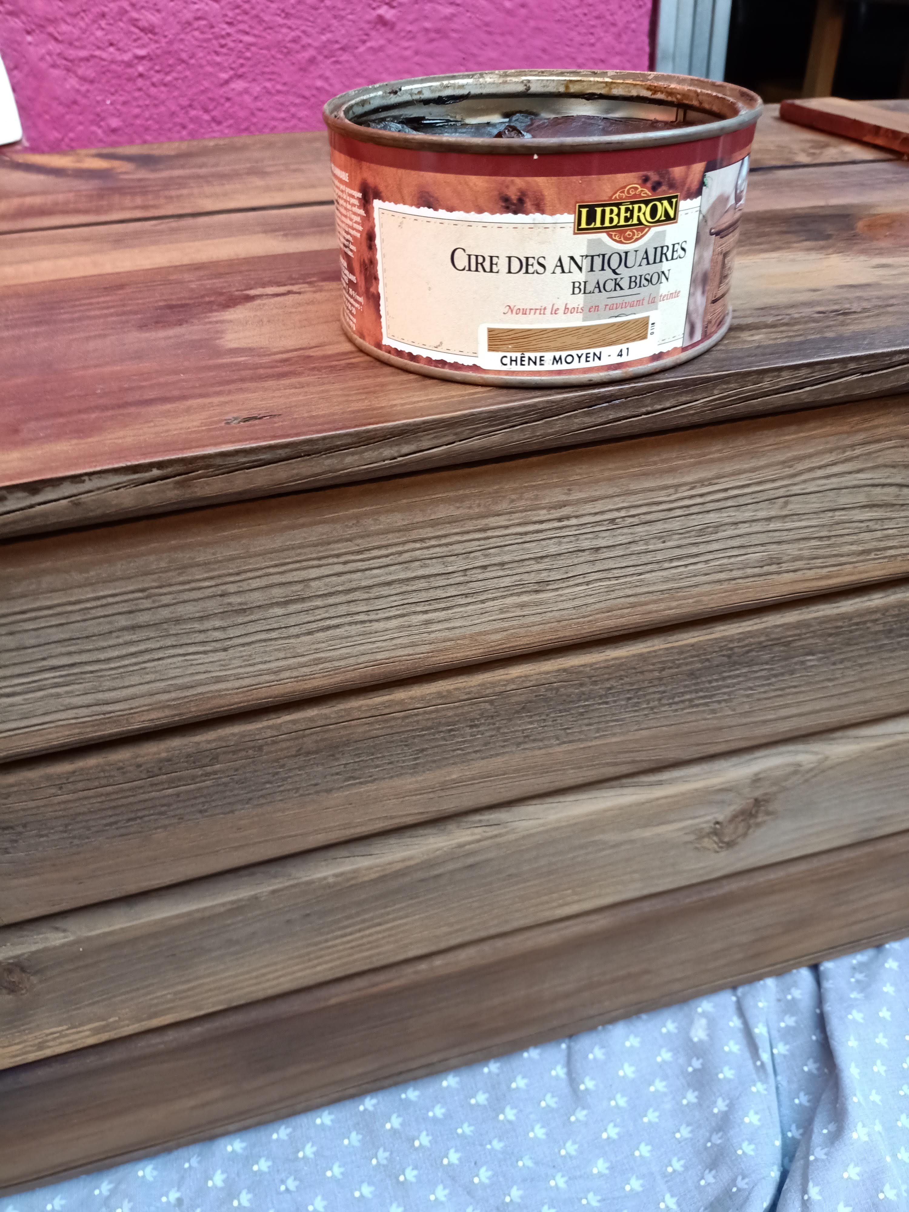 5 una vez seco lo seguí nutriendo con una cera en crema (color Roble Medio) para recrear la patina del roble