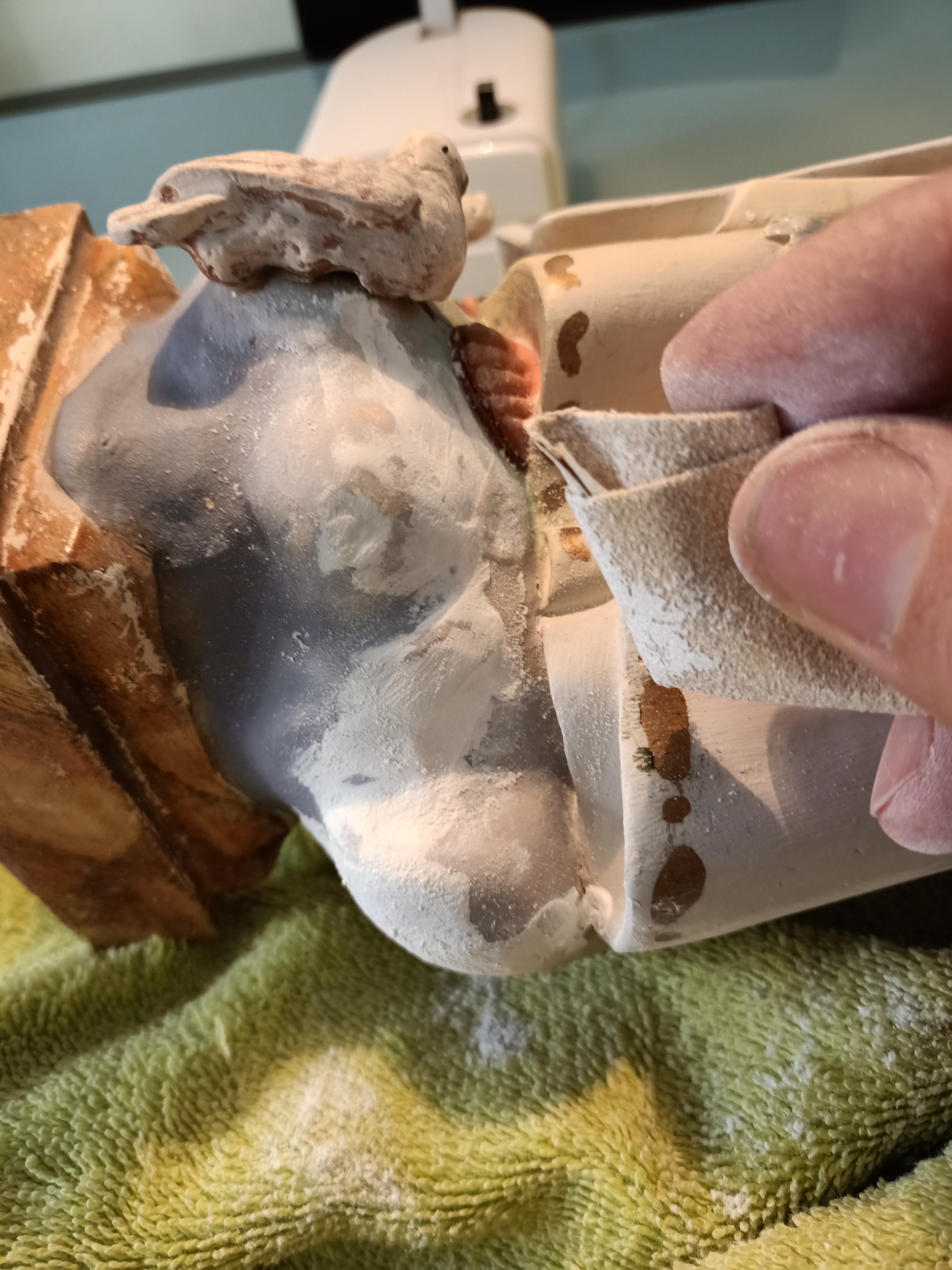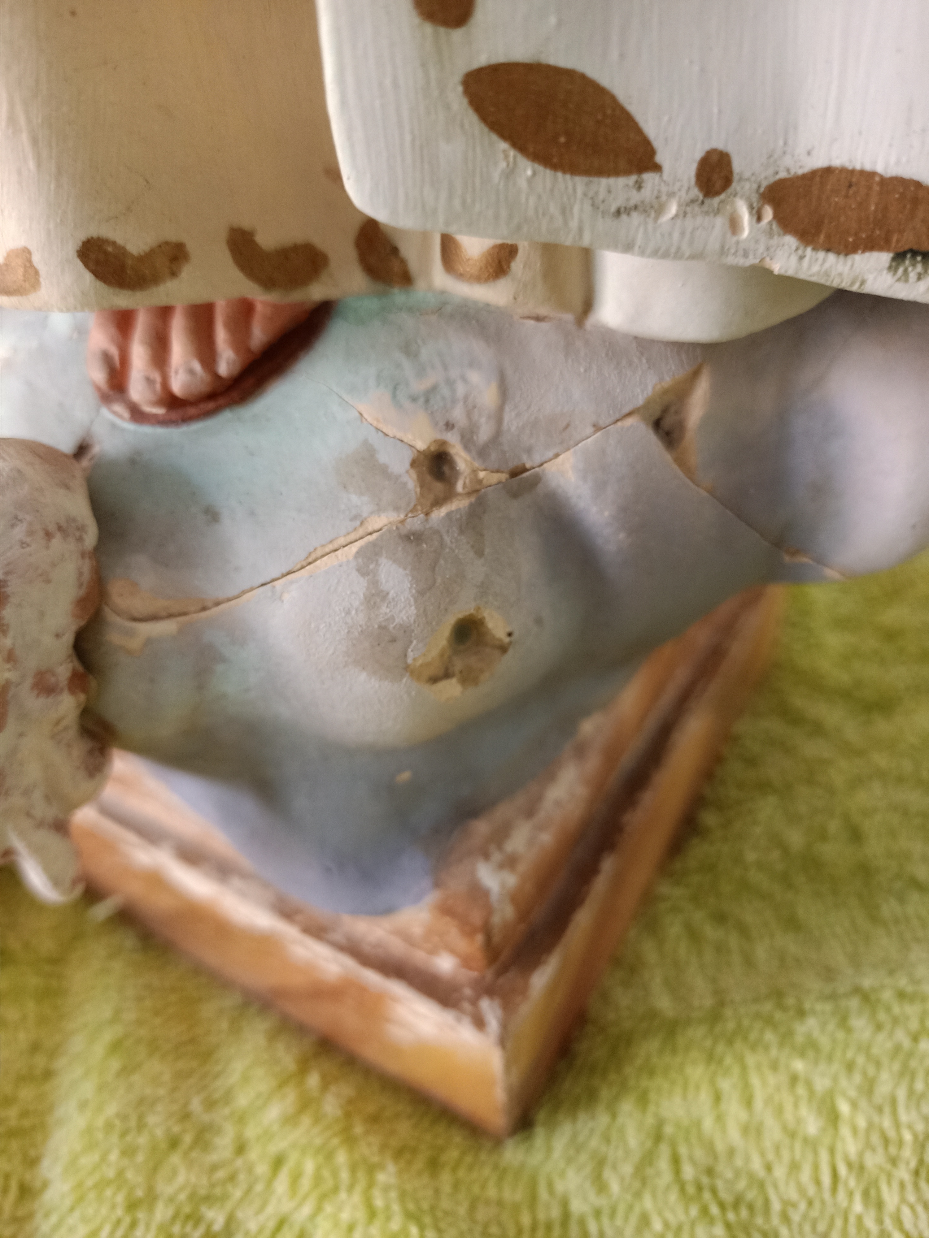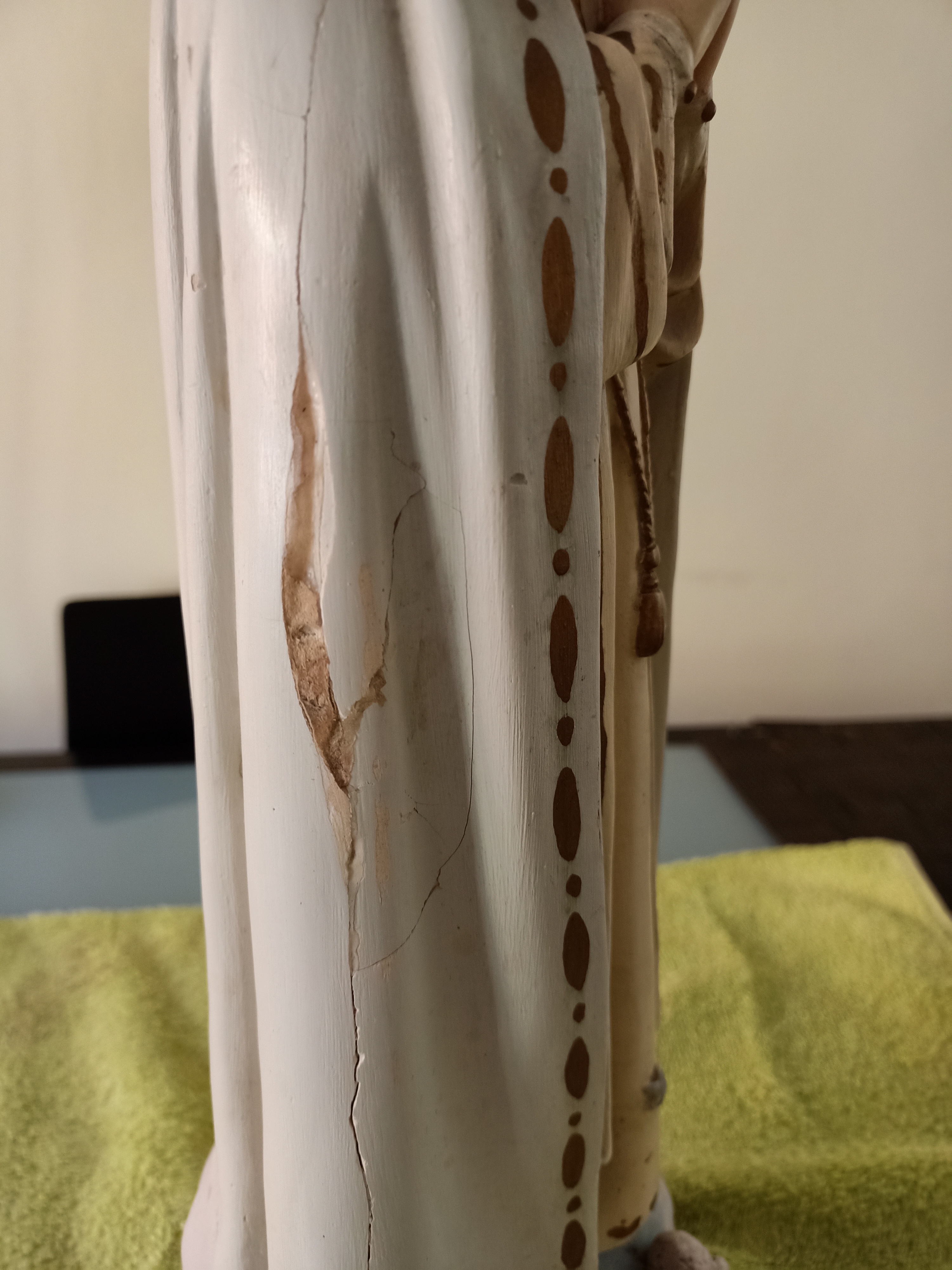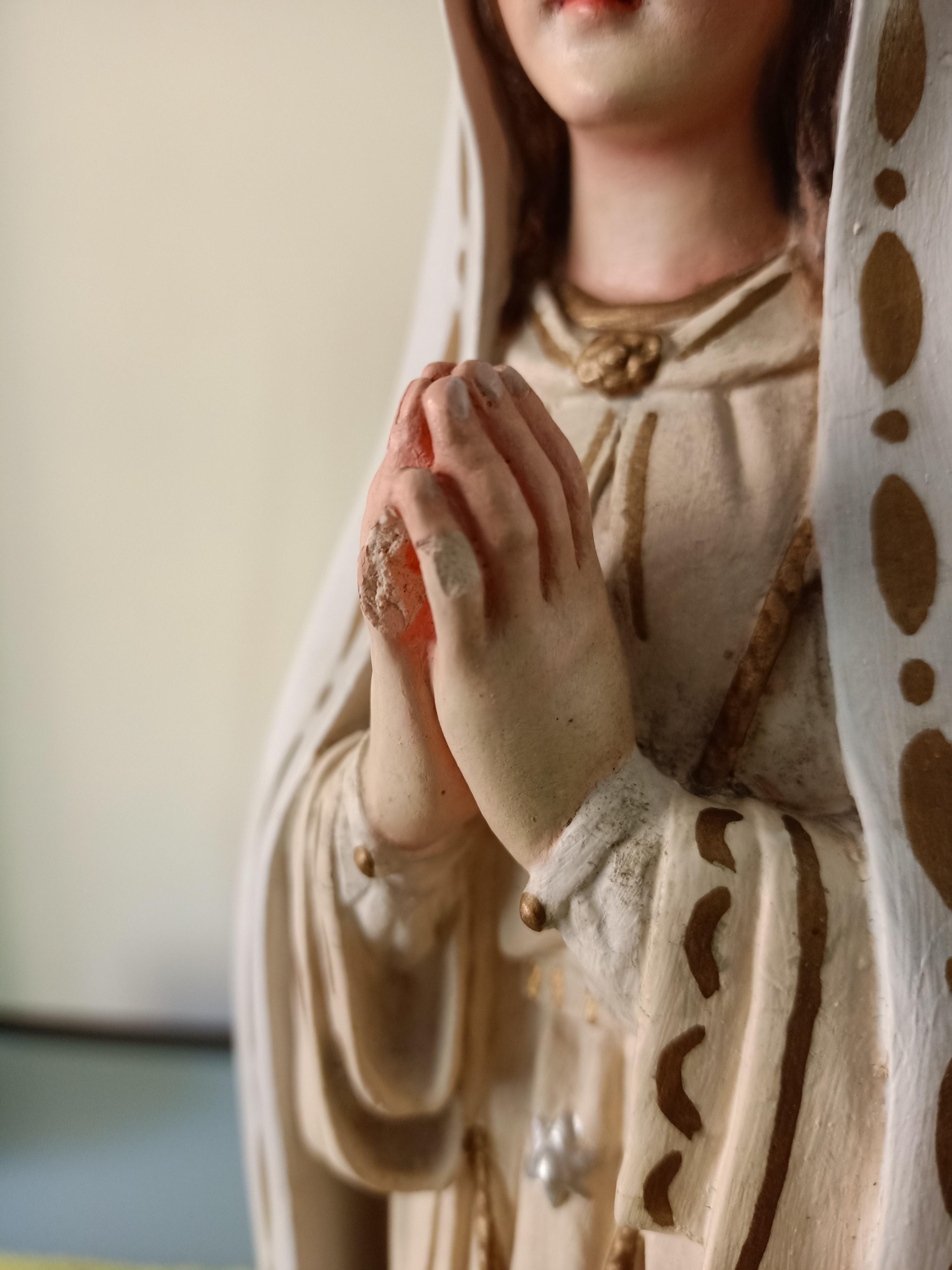En un rastrillo encontré esta imagen de la Virgen Maria, producida en los años 40 en los talleres de Arte Cristiano de Olot, Gerona. Como la mayoría de las imágenes de Olot está hecha de pasta de cartón madera. Estaba en muy mal estado (muchas roturas y fisuras)
