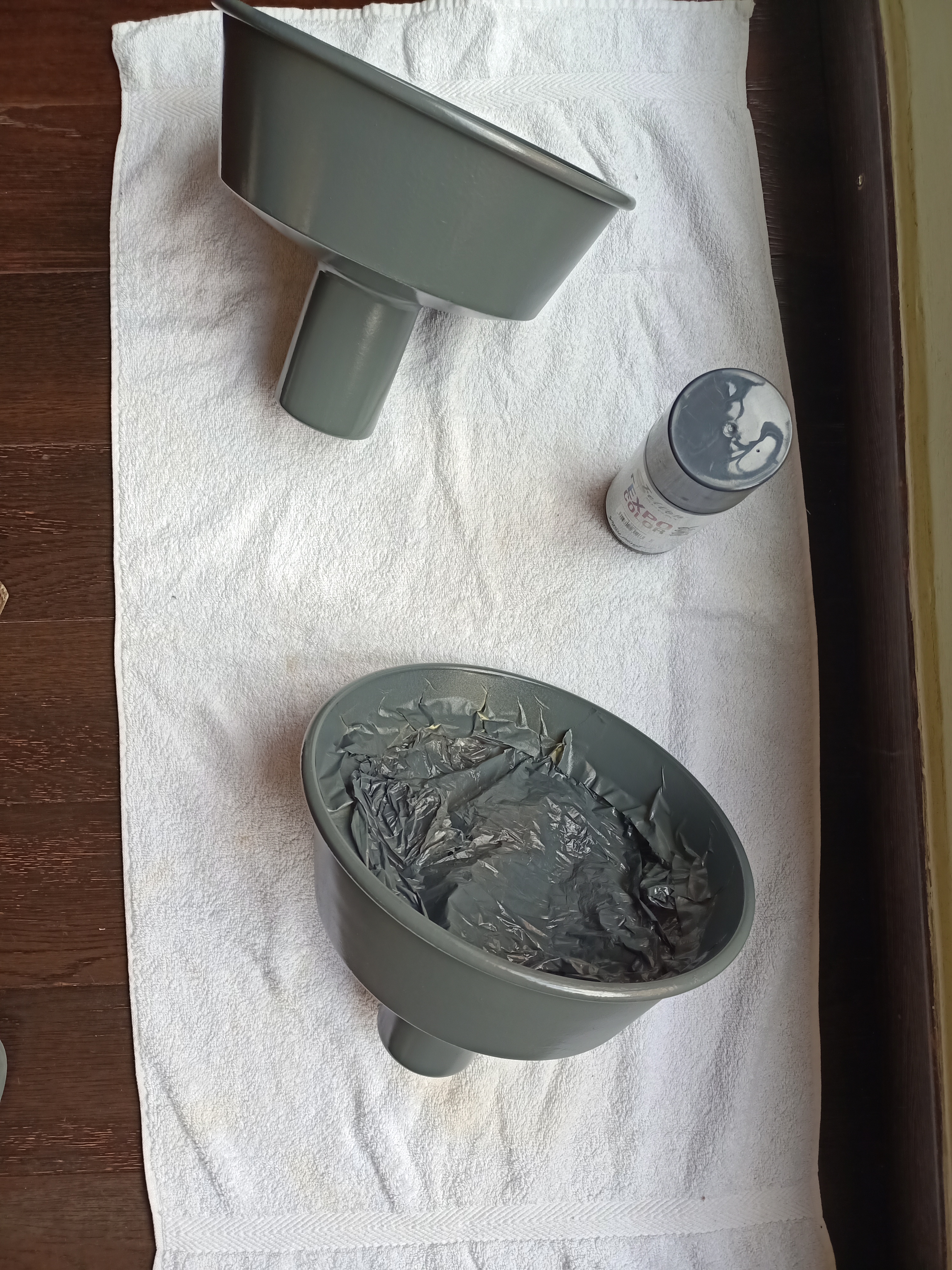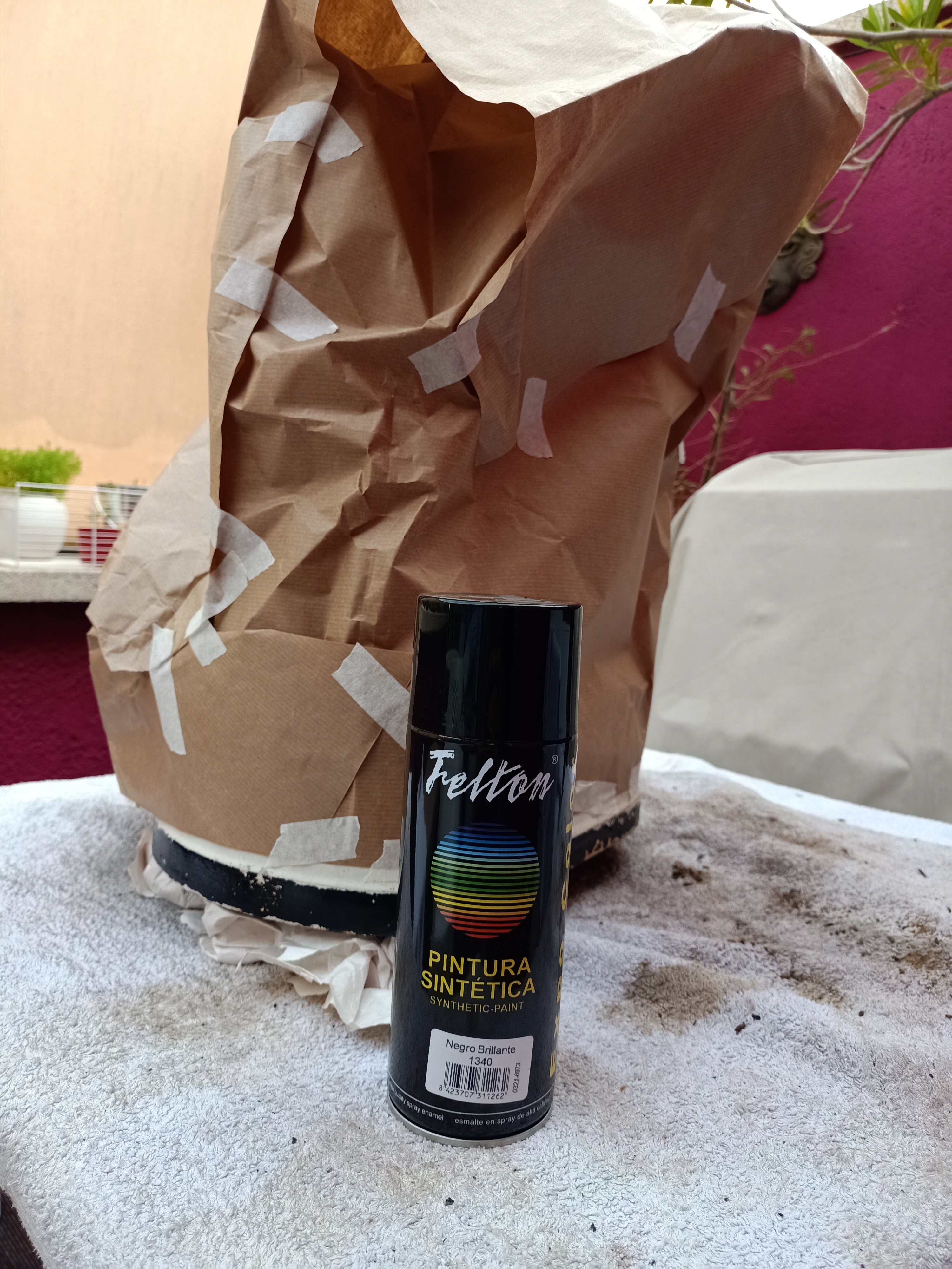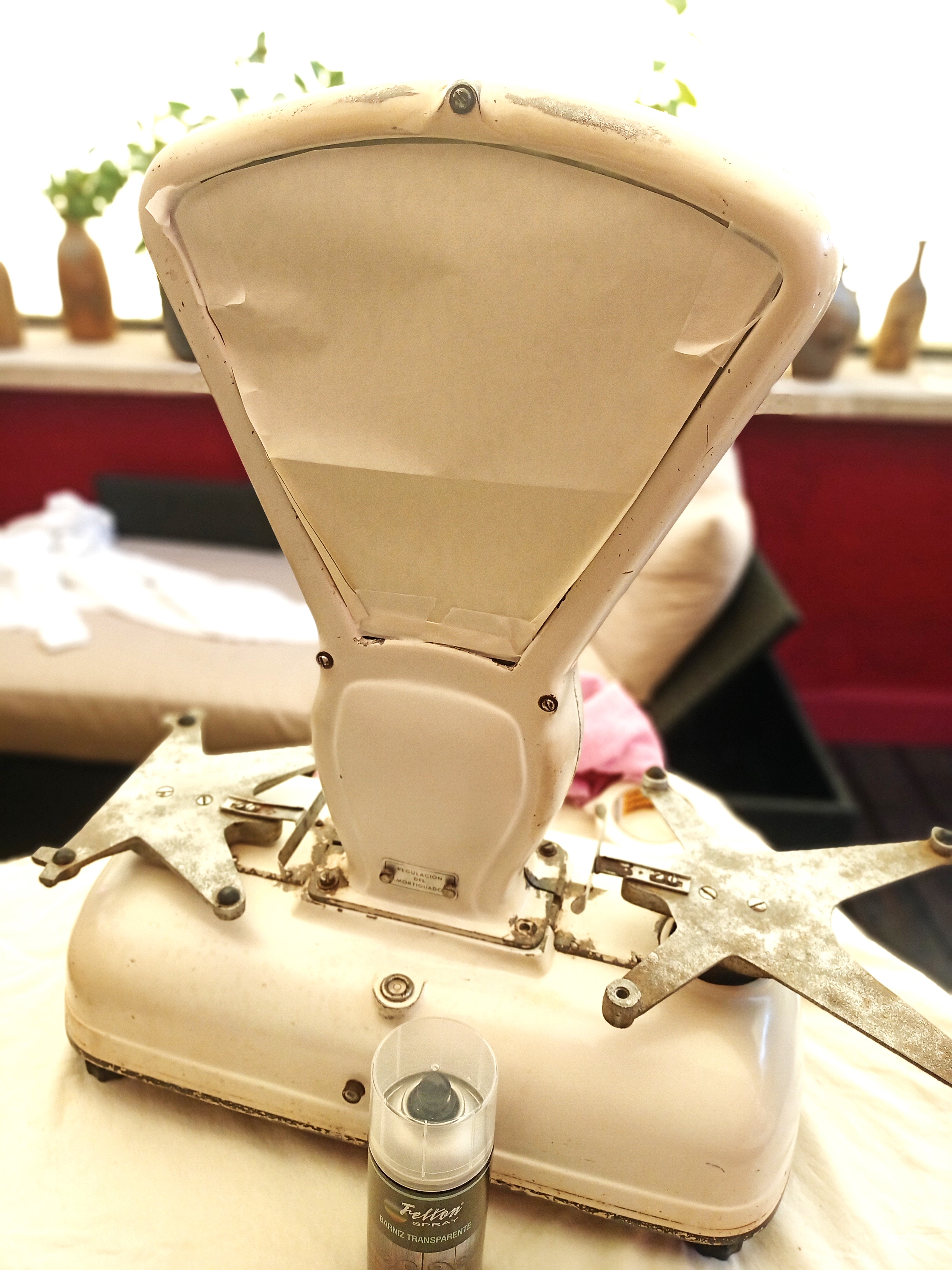 7 Luego proteger la bascula con papel y cinta carrocera antes de pintarle con spray negro satinado su «lazo negro» alrededor de su base (ya que estaba muy desconchada)