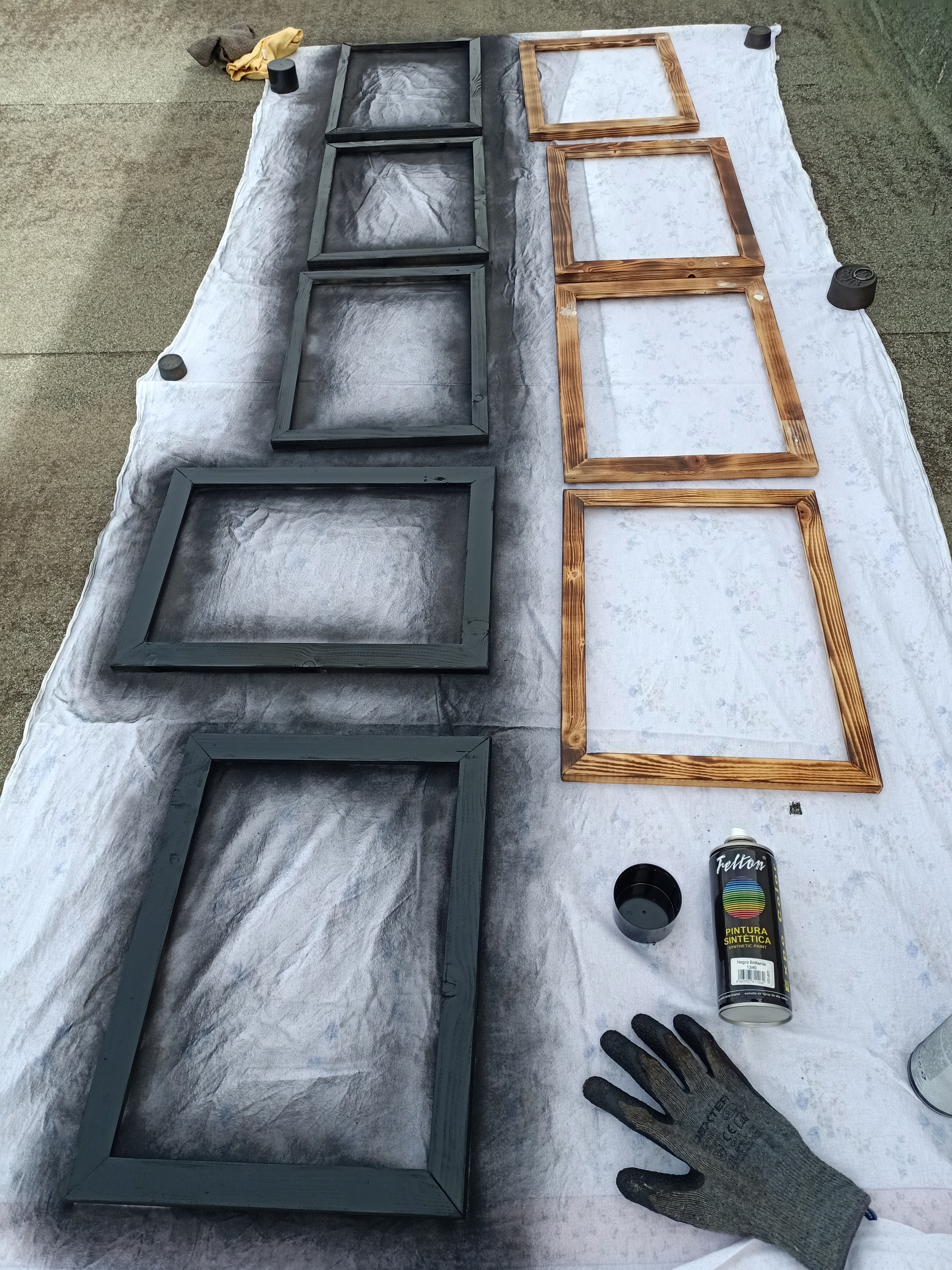 3 Con un spray de esmalte alquídico (acabado negro brillante) le di 2 capas a los marcos (recto y verso)