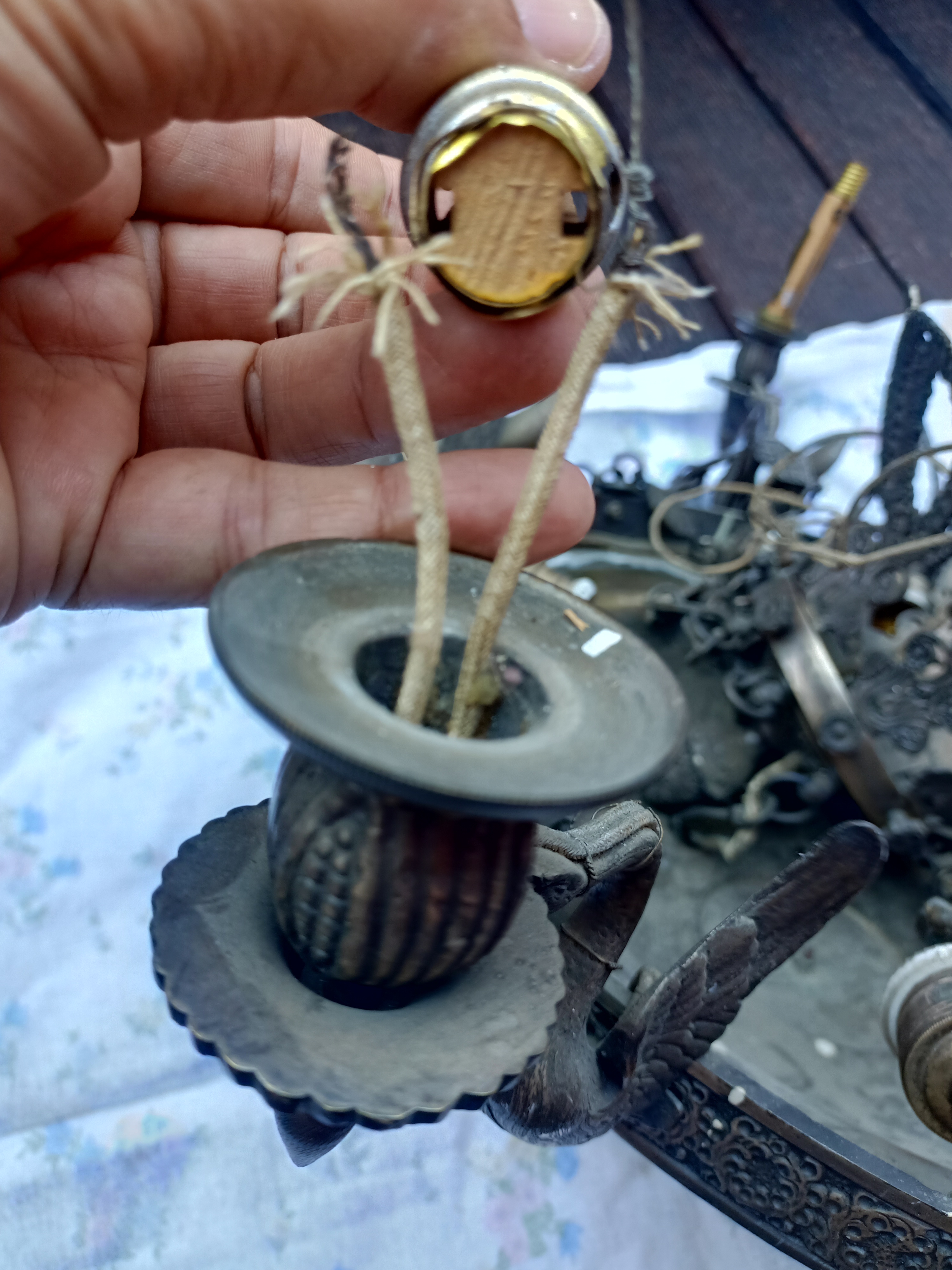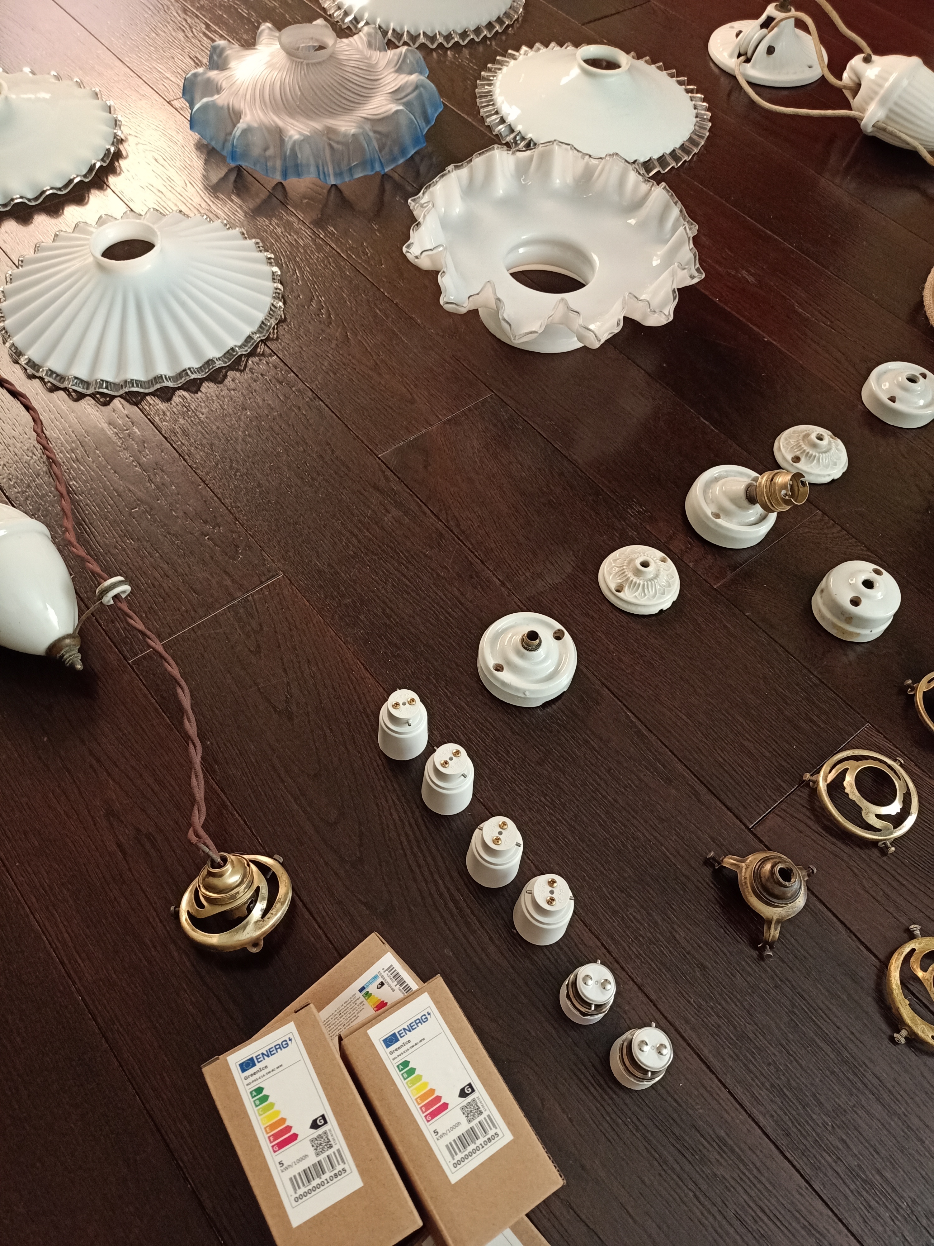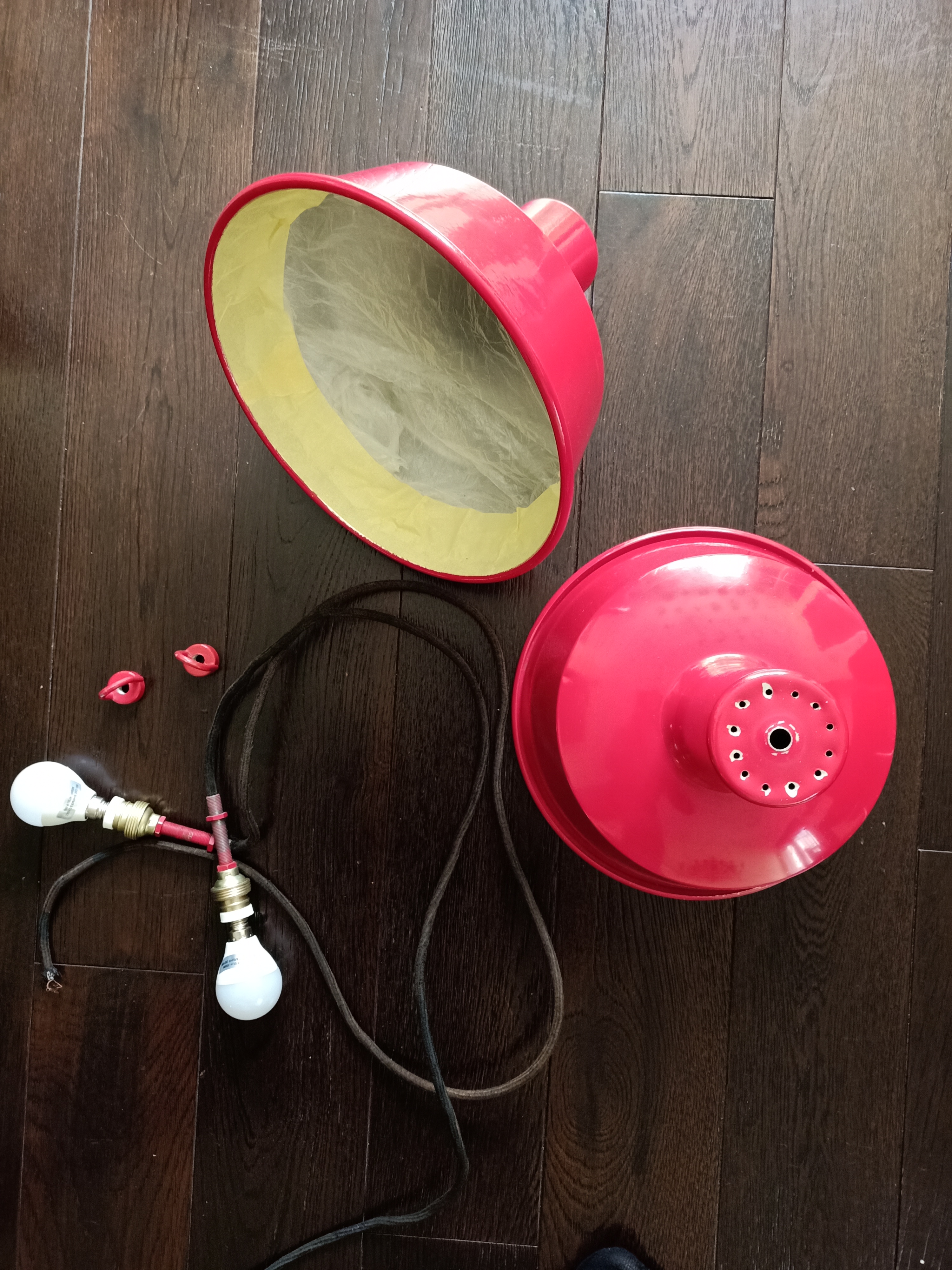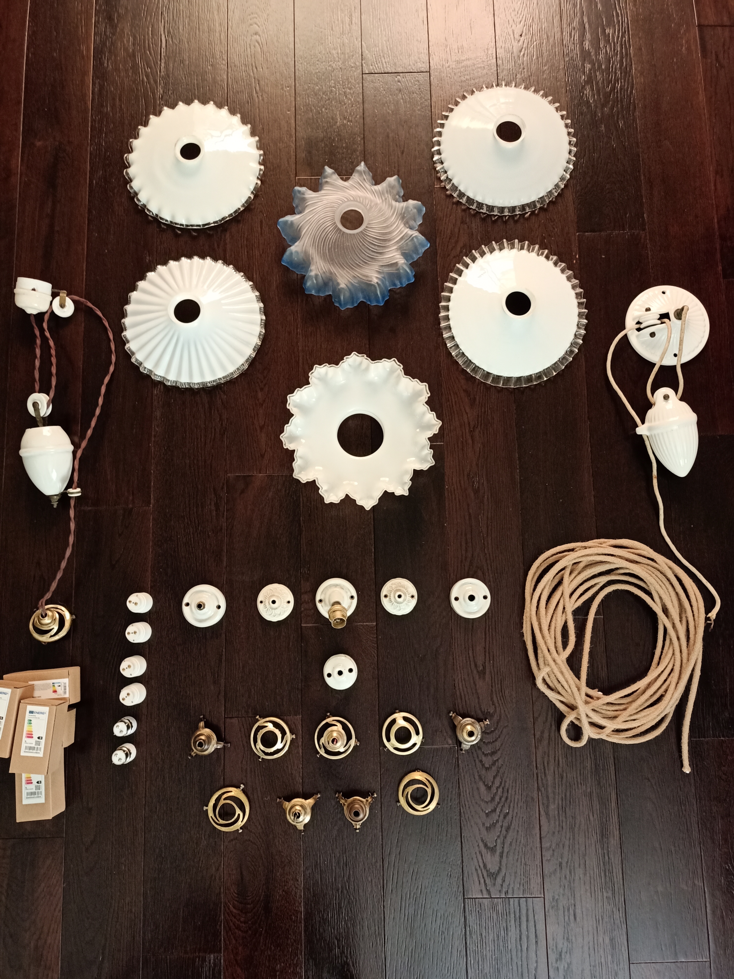Aquí el reto no es tanto la restauración en sí ya que el funcionamiento de estas Lámparas de Suspensión es bastante básico. El verdadero reto es conseguir todos los componentes originales y auténticos para recomponer esas bellezas. Después de haber recorrido unos 10 rastrillos en Hauts de France por fin ya tenía todas las partes necesarias.