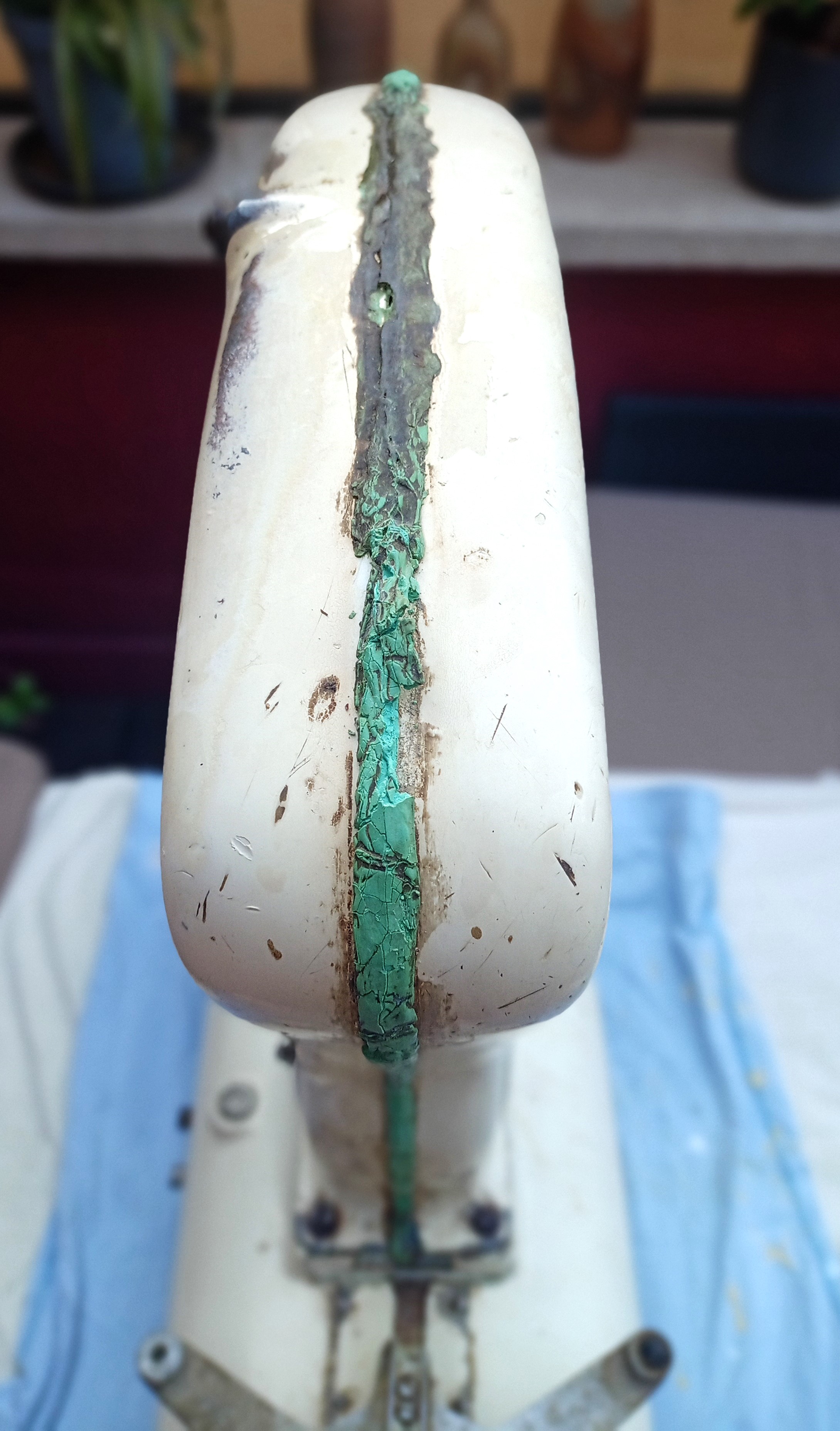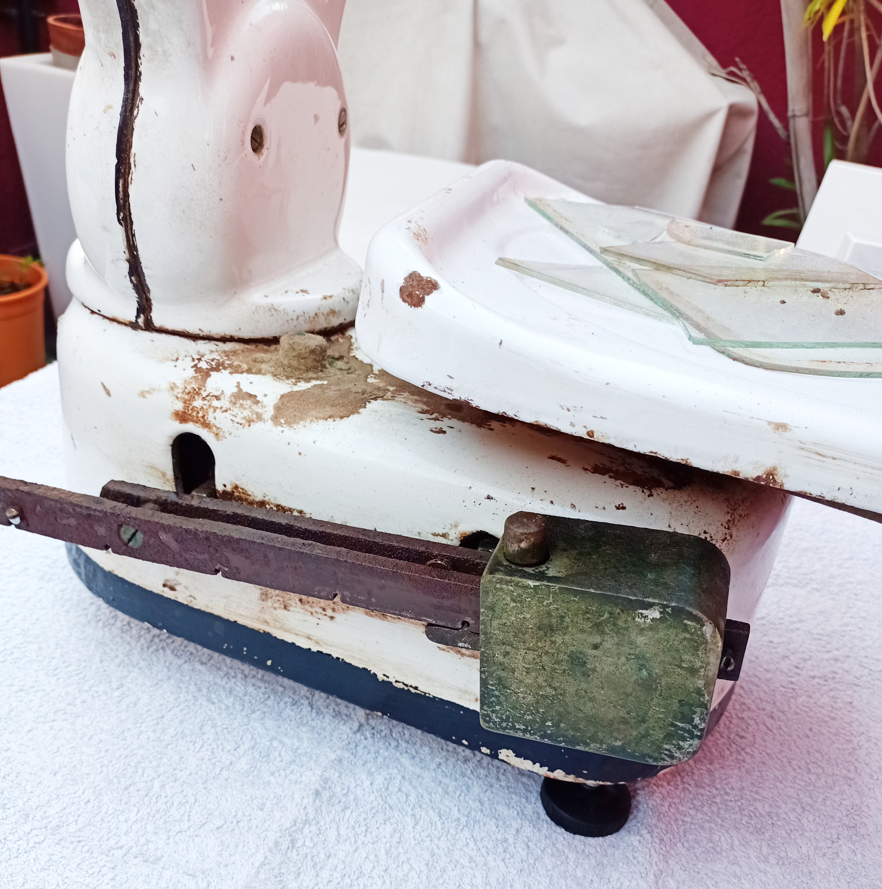 Compré esta magnífica Báscula de ultramarinos «Berkel» (Bélgica – Años 50) y necesitaba una buen limpieza. La parte esmaltada en blanco estaba sucia pero en perfectas condiciones. Los elementos de hierro no esmaltados estaban muy oxidados