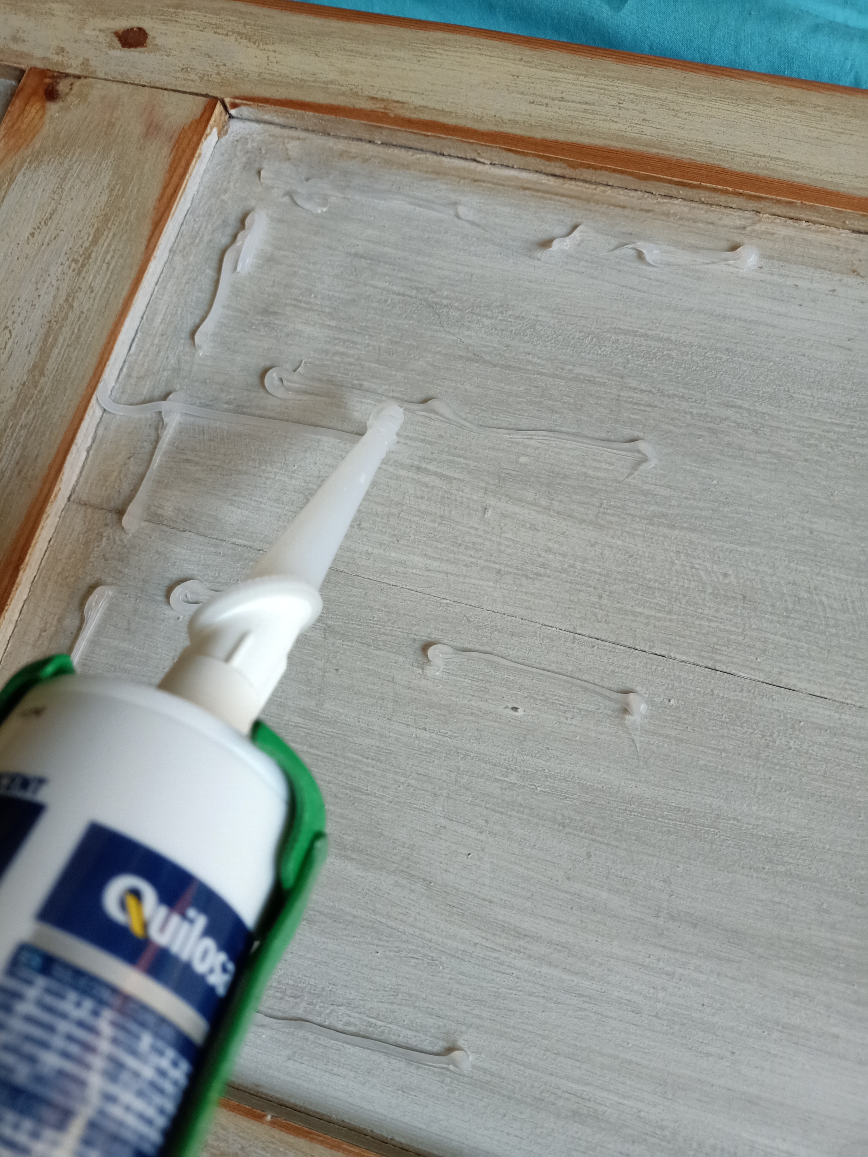 6 Comprar un pegamento especial espejos (sin acetona ya que este componente es abrasivo para el espejo), aplicar cordones horizontales y verticales en los cuadros interiores, colocar los espejos y apretar para que agarren bien a la madera, dejar peso encima (unos libros por ejemplo) durante 24h…