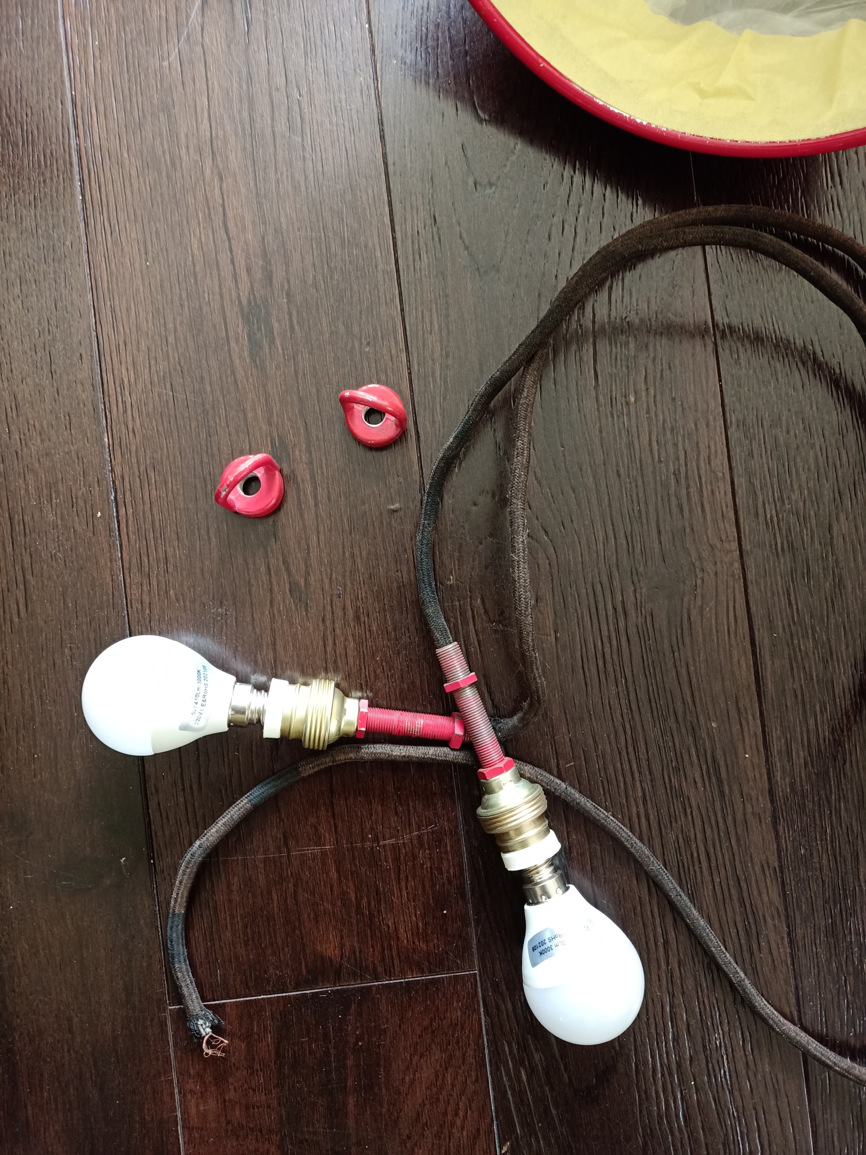 Aunque estas lámparas industriales eran muy guapos en rojo les quise dar otro toque más elegante y «toned down» y además el cableado necesitaba un cambio…
