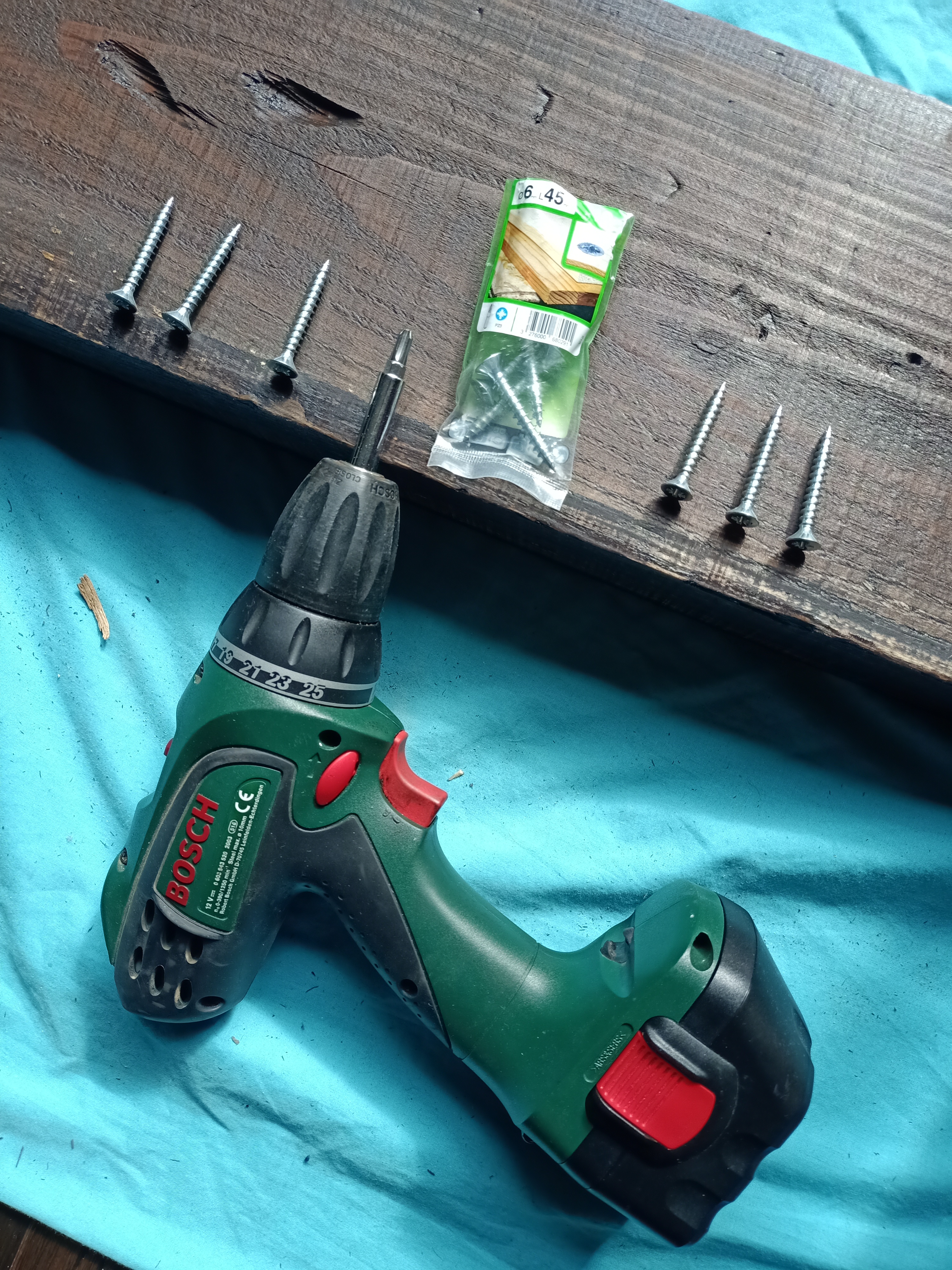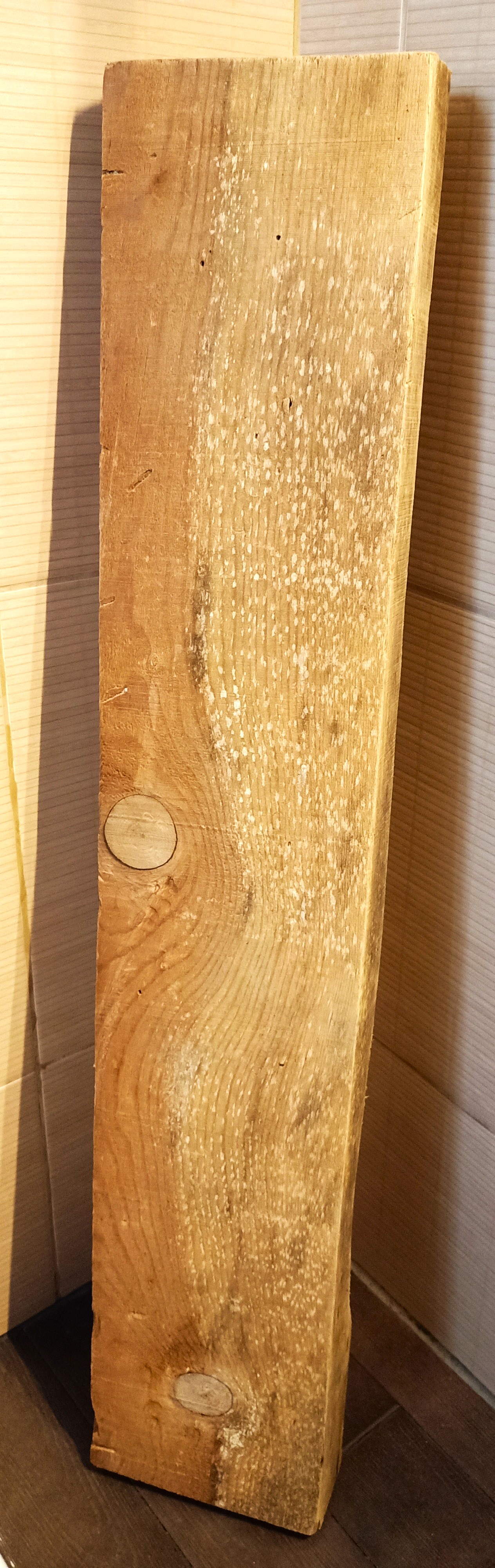 1 encontramos una viga de pino de 100x20x5cm (sucia y algo húmeda), la lavamos y la cepillamos para quitarlo todo el polvo y la dejamos secar al sol 3-4 días