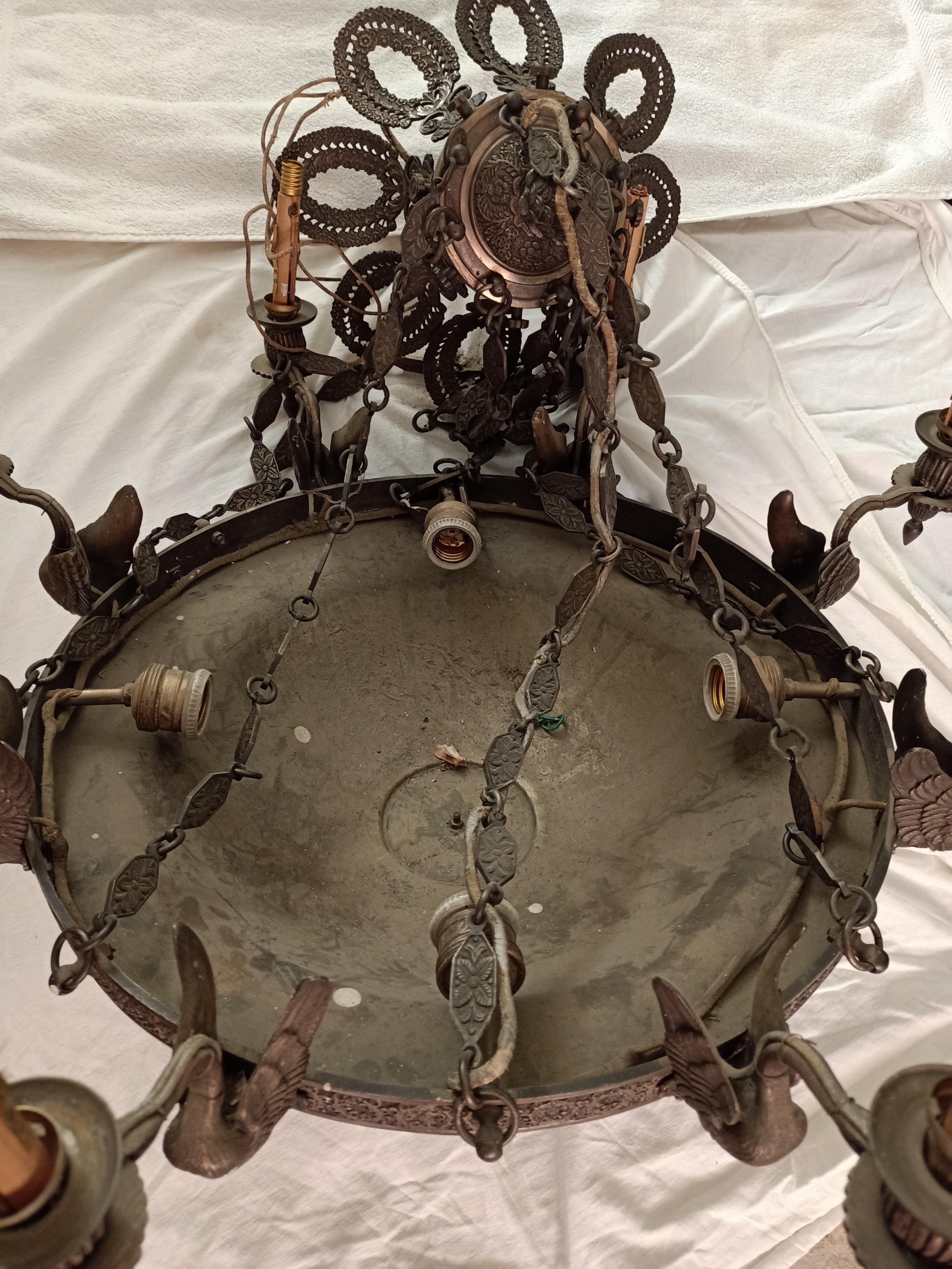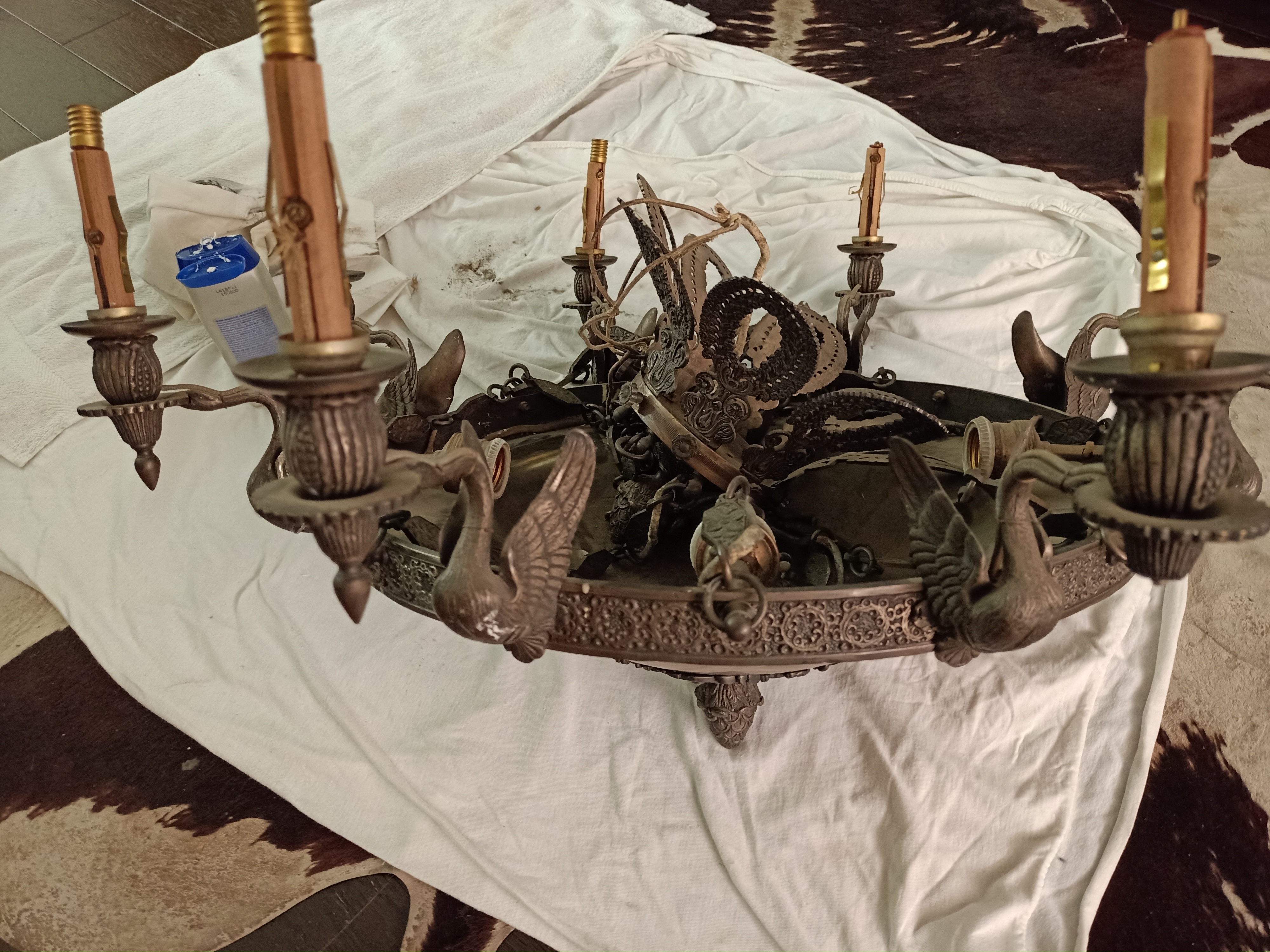 1 Primero al ser una lámpara tan «elaborada» y tan pesada (12kg) decidimos desmontar todas las partes para tratar cada una de manera individual y facilitar su manejo: desmontar las 6 cadenas, los 12 cisnes y sus casquillos, quitar el antiguo sistema eléctrico de «tela», el embellecedor de la cúpula,…