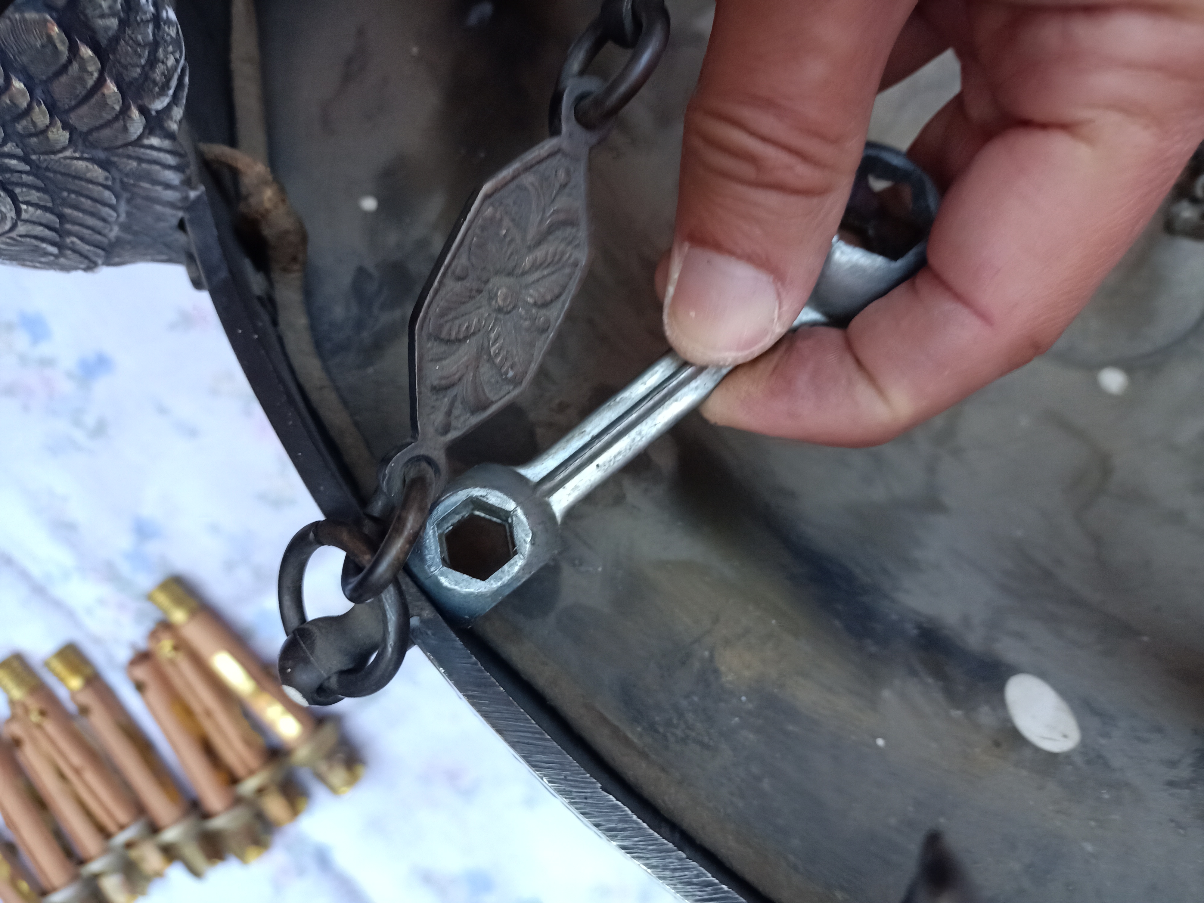 1- hemos quitado toda la pintura lijando toda la superficie con una máquina rotativa (tipo destornillador eléctrico) con 2 boquillas diferentes (una de metal y otra de plástico duro) para llegar a cada esquina y ángulo del aplique