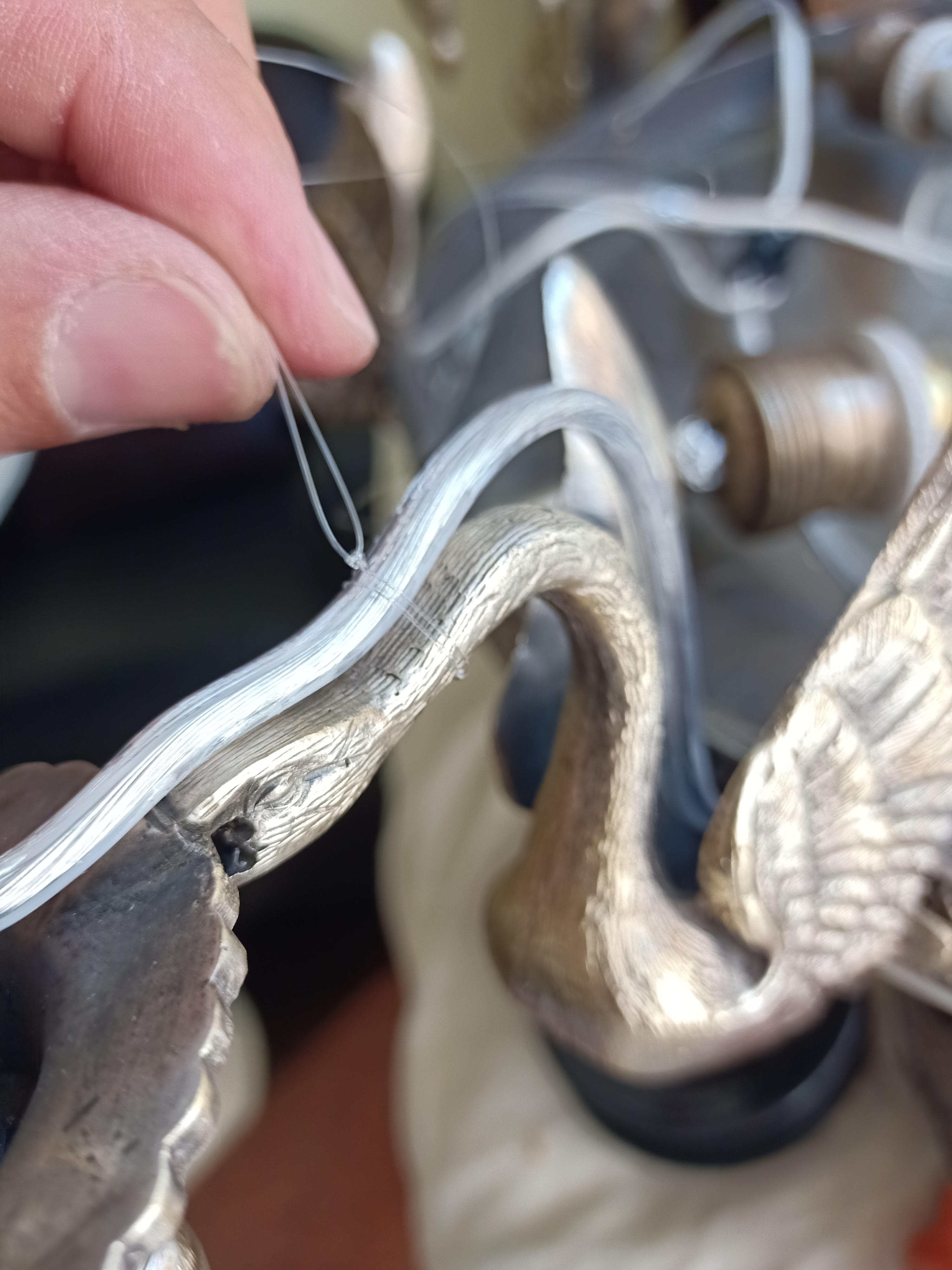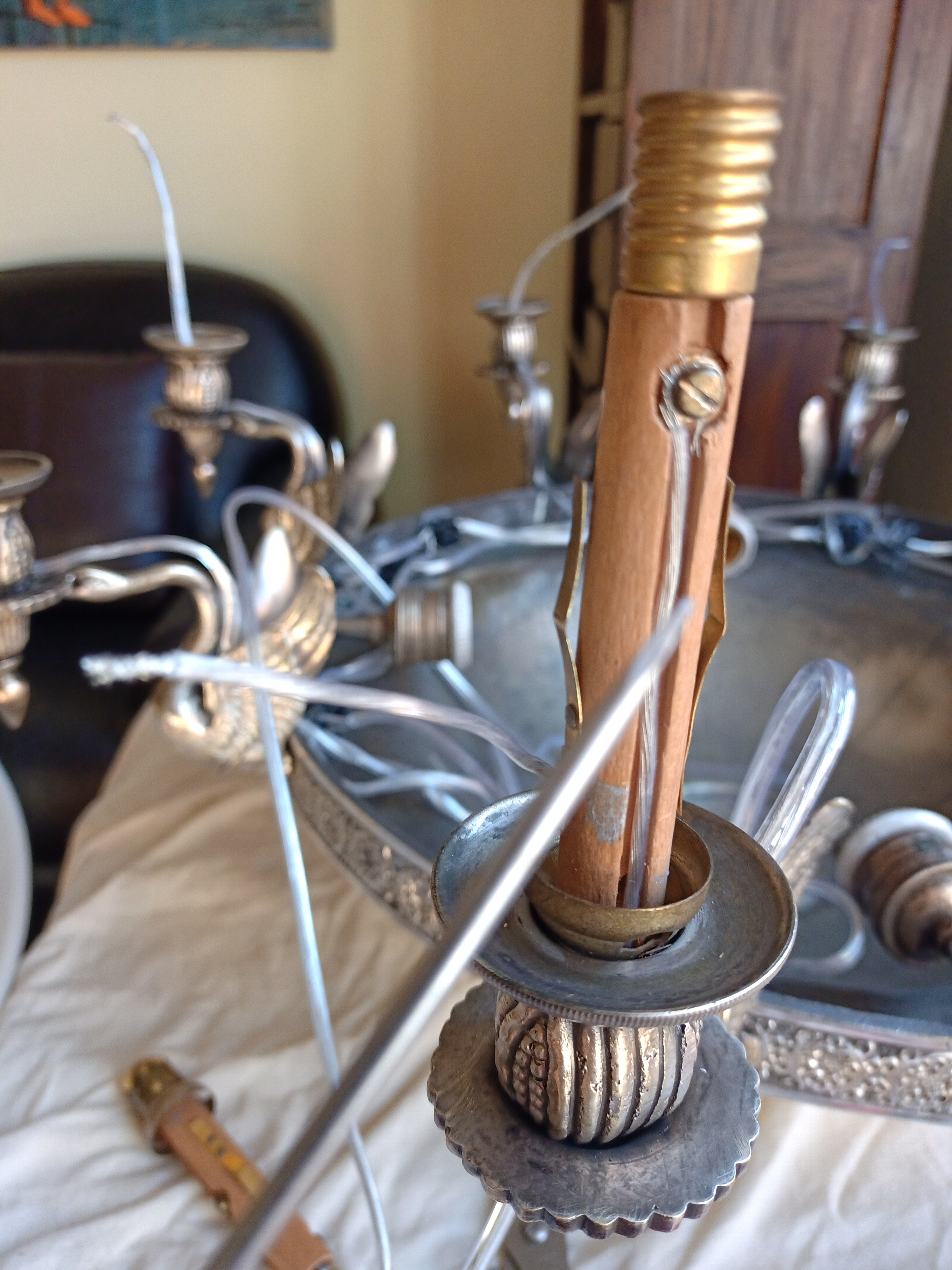 3 Después de más de 25h de lustre podemos atacar la parte eléctrica: soldar los casquillos rotos y sobre todo re-cablear todo el chandelier respetando su configuración original: 4 puntos de luz interiores + 8 puntos de luz «cisnes». Elegimos un cable fino y transparente para que sea lo más discreto posible. Para fijarlo encima de los cisnes utilizamos un hilo de pesca transparente y muy resistente