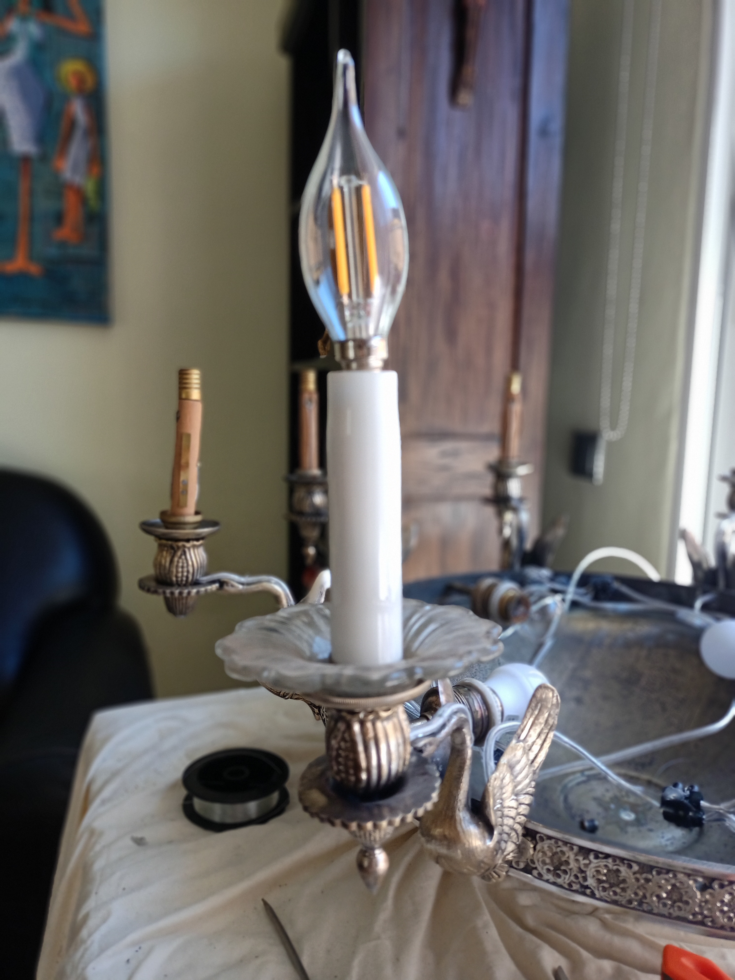 4 una vez la instalación eléctrica terminada fijamos la parte superior del chandelier a su cúpula y añadimos lo últimos elementos estéticos originales: los platillos de cristal, los cubre casquillos de opalina blanca y las bombillas vela led de filamento